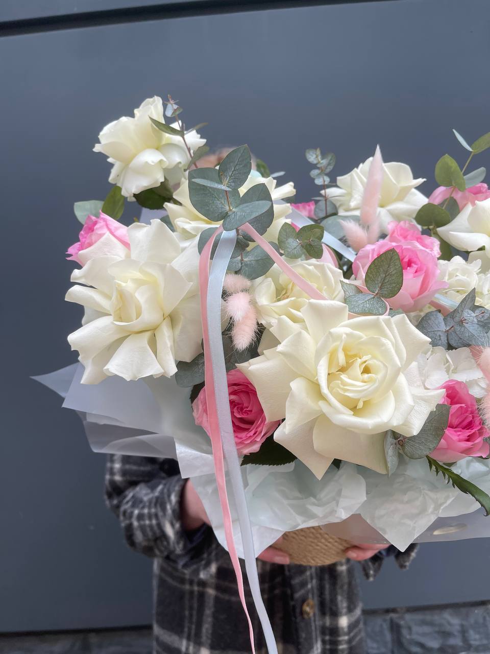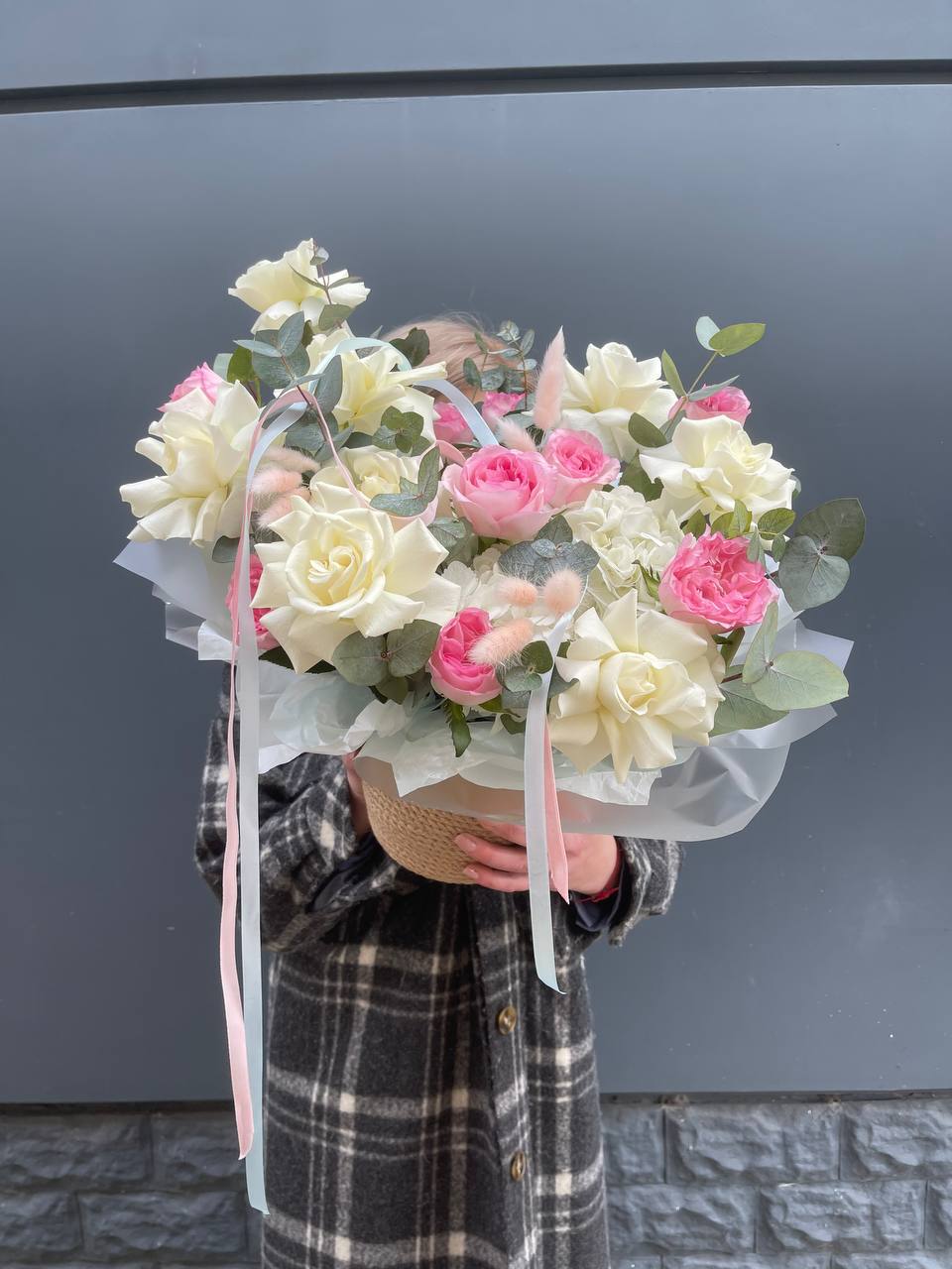 пионовидные розы Мисти Бабблс, гортензия, розы, диантусы, эустома, маттиола, джутовое кашпо, стифа, эвкалипт.
