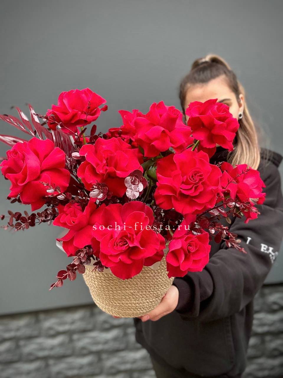 Французские розы теплого оттенка раскрываются в окружении эвкалипта и листьев Чико. Композиция в джутовом кашпо выглядит самодостаточно и гармонично вписывается в любое пространство.