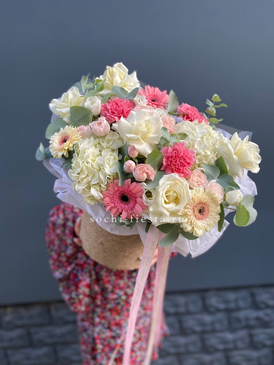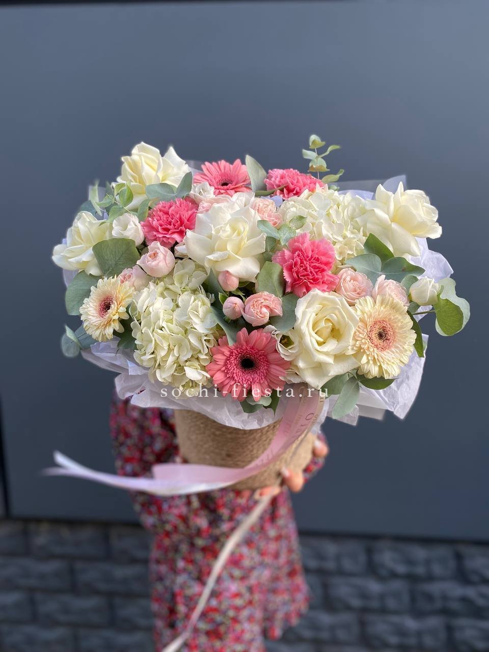 Мягкая палитра белых оттенков с вкраплениями диантуса создает воздушную композицию в натуральном джутовом кашпо. Кустовые розы добавляют объем, а эвкалипт завершает природную гармонию. Готовое решение для интерьера в спокойных тонах.
