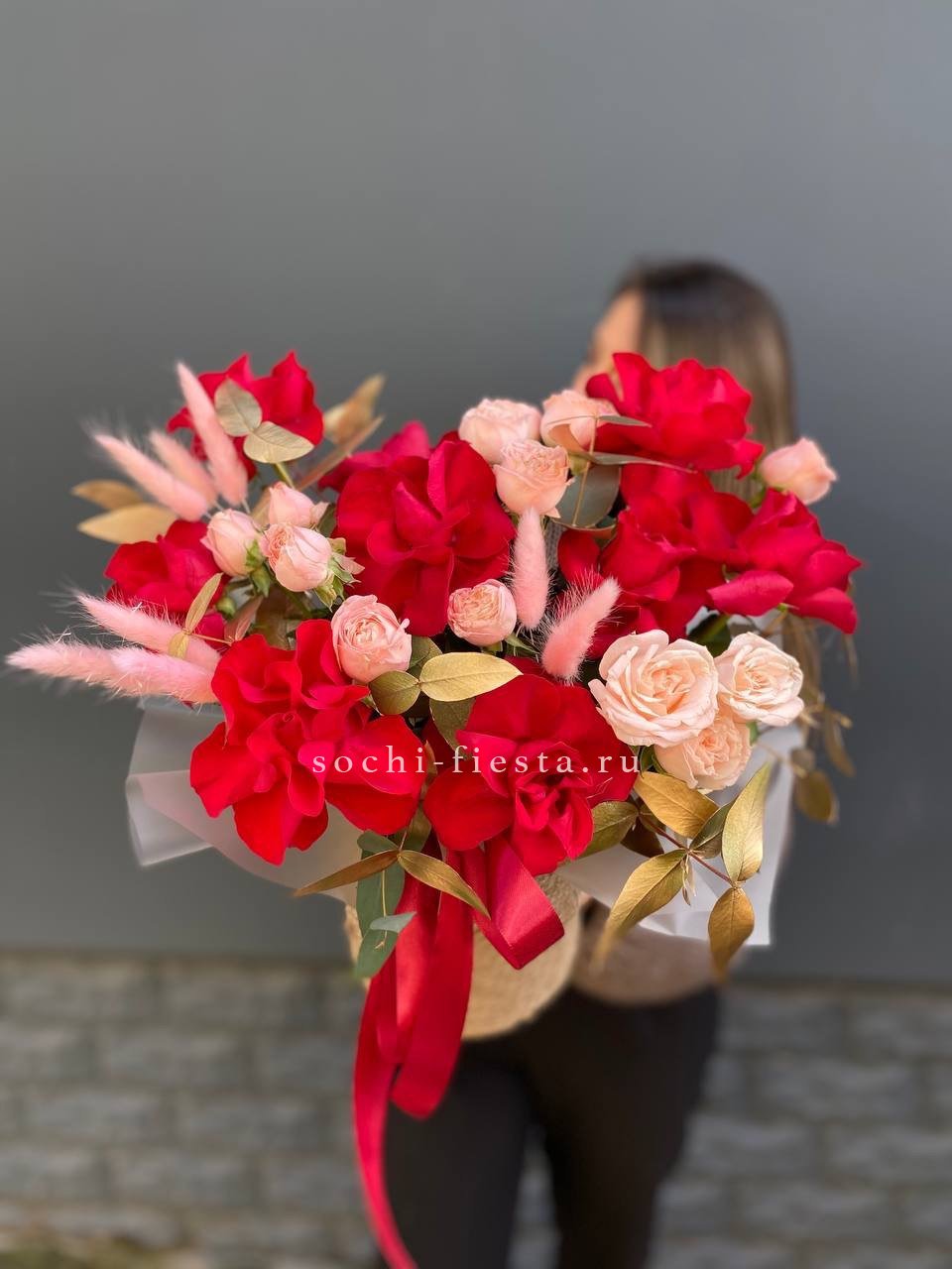 розовые розы, пионовидные кустовые, эустома, ранункулюс (возможна замена в зависимости от сезонности) в джутовом кашпо с элементами бус и перьев.