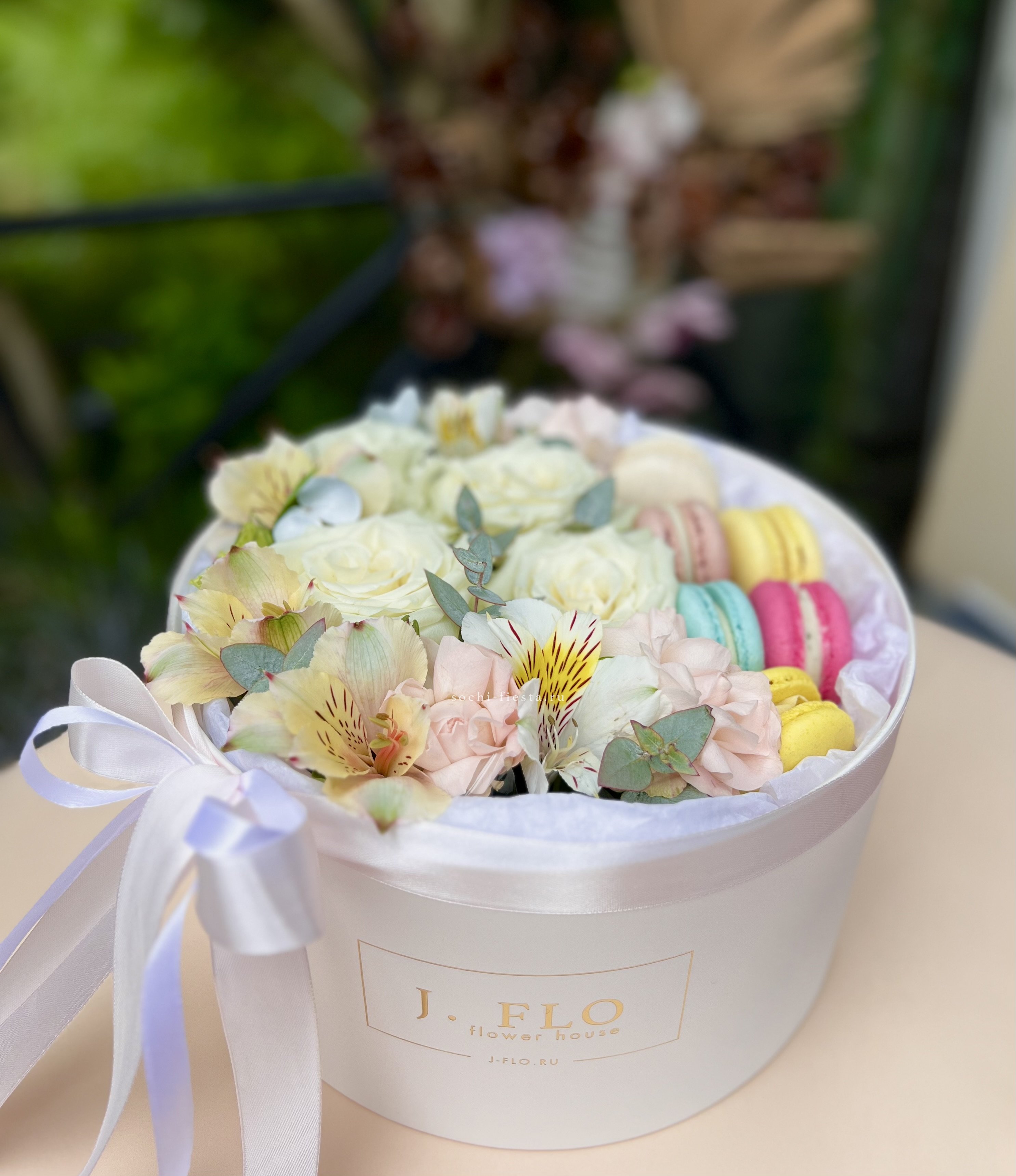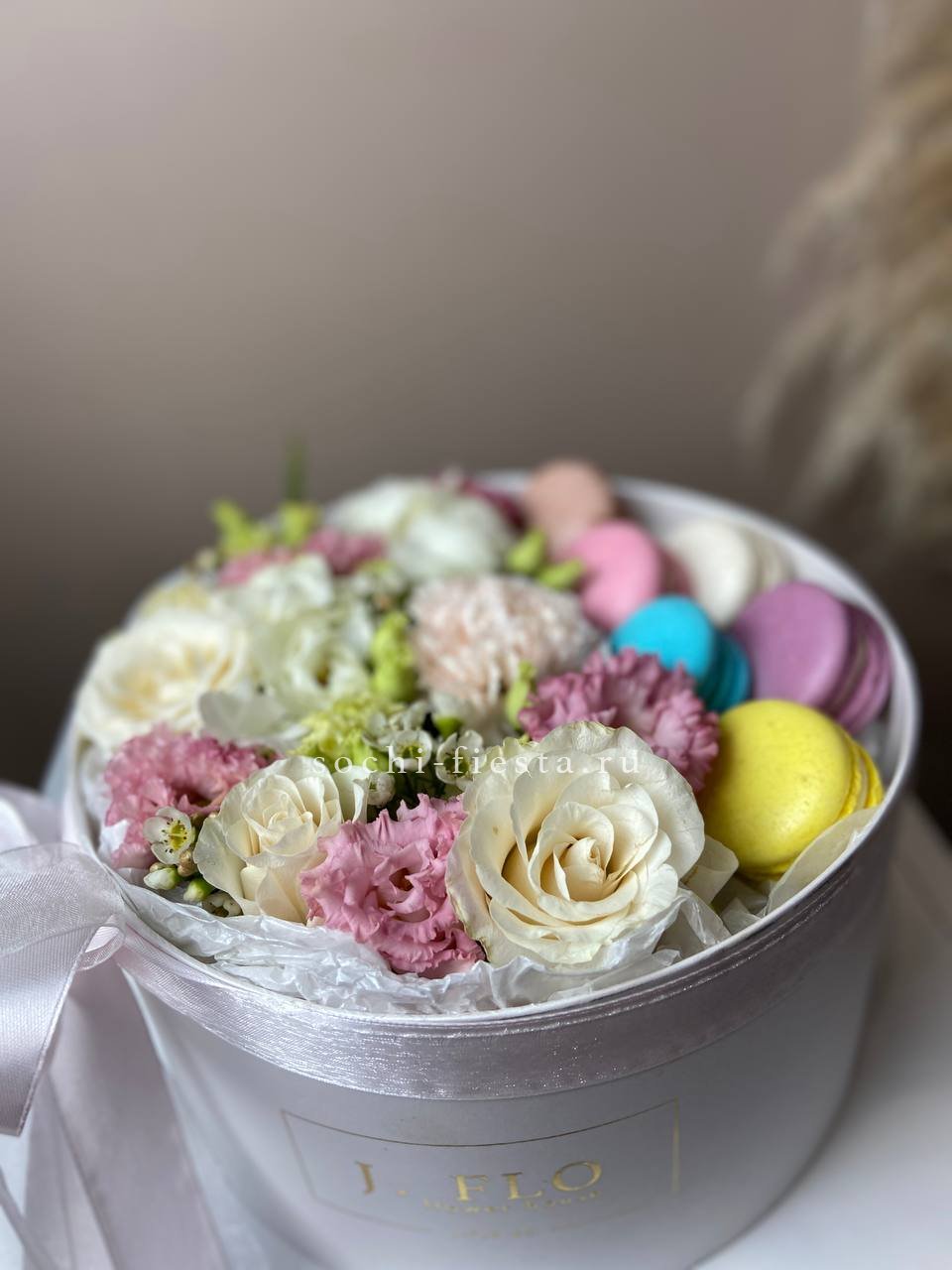 роза кустовая, эустома, диантус,  эвкалипт, 5 макаронс, белый цилиндр D15 Цвет коробки может быть согласован с клиентом.  Наполнение может меняться по наличию.