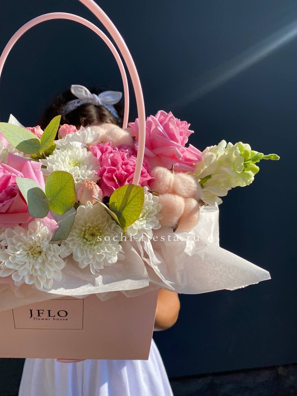 Хризантемы и кустовые розы раскрываются слоями, создавая воздушную текстуру. Эустома добавляет глубину, а эвкалипт формирует естественный контур. Композиция в боксе держит форму и долго сохраняет свежесть.