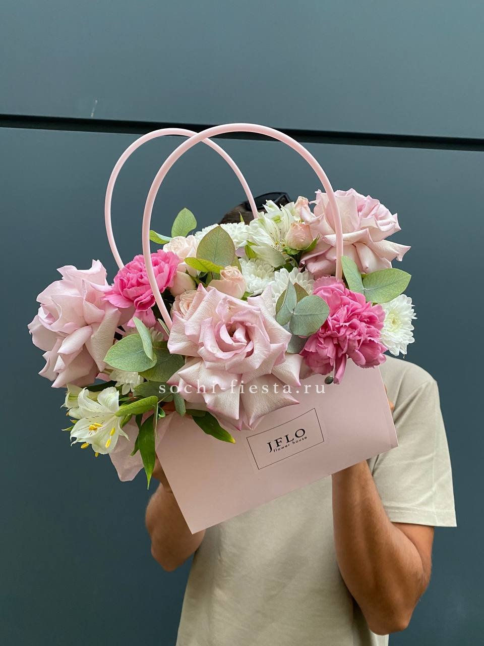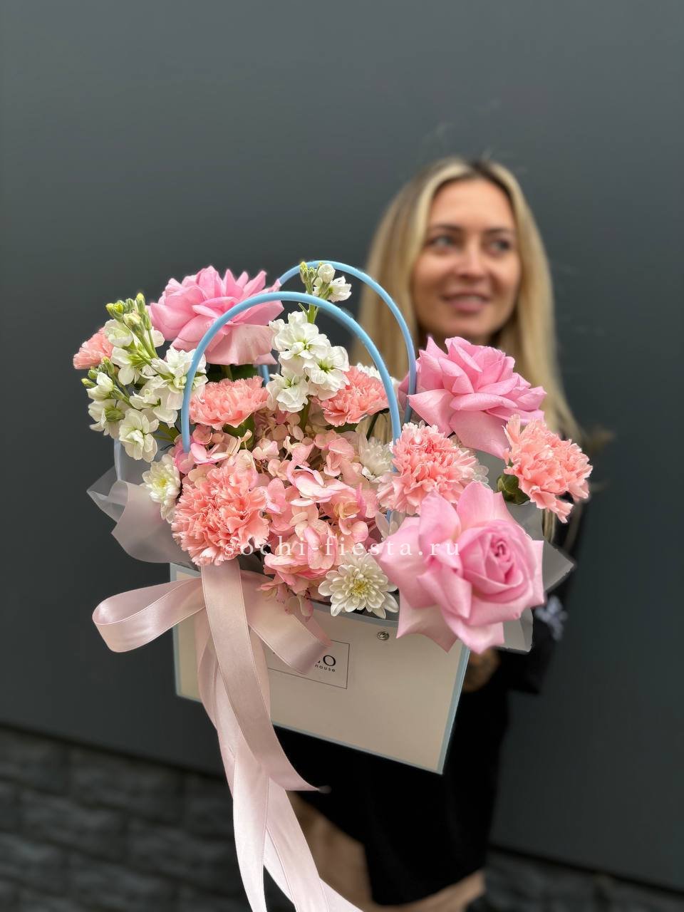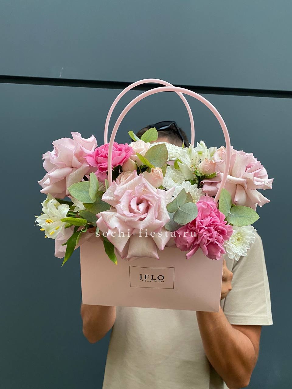 Пышные головки пионовидных роз задают объём, а мелкие соцветия диантуса разбивают плотность. Гортензия добавляет воздушную текстуру, эвкалипт смягчает линии. Композиция в сумке-кашпо выглядит свободно и живо.