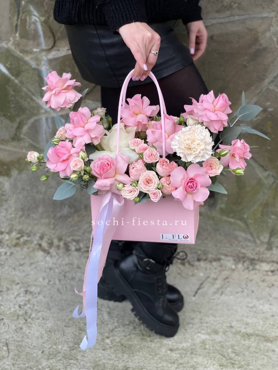 Розовые розы и диантусы переплетаются с кустовыми хризантемами в плотной округлой композиции. Альстромерия добавляет графичные акценты между бутонами. Сумочка собирает все элементы в аккуратную форму с естественным объёмом.