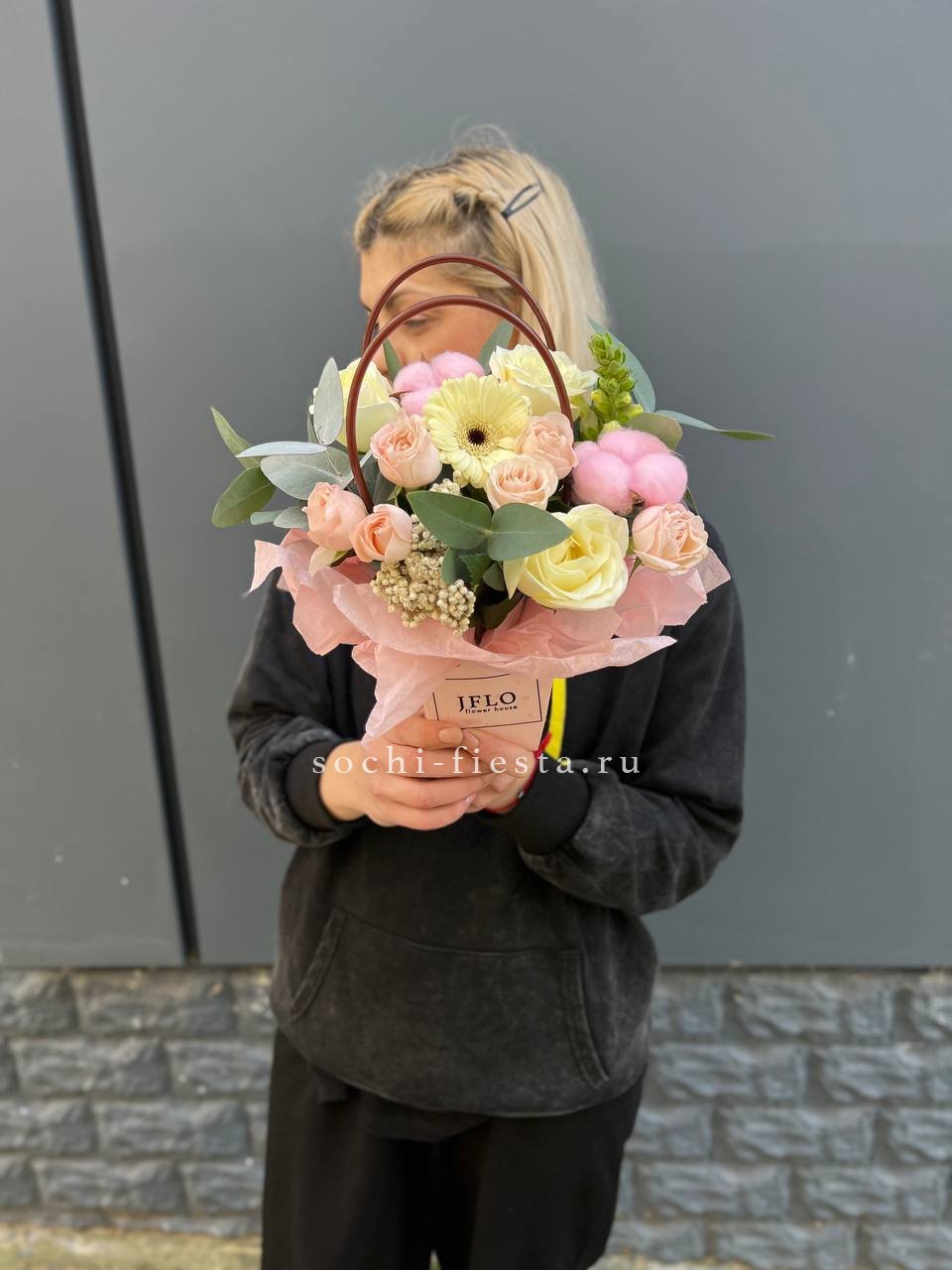 Яркая композиция в удобной сумочке объединяет розы Джумилия с герберами и воздушными соцветиями. Хлопок и лагурус добавляют природной легкости, а диантус создает цветовую динамику.