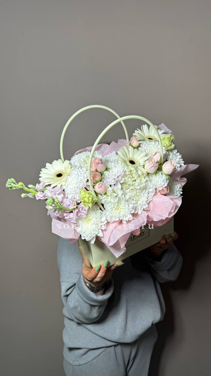 Белые розы и хризантемы сочетаются с воздушной эустомой и хлопком в сумочке. Светлая гамма с прохладным оттенком напоминает морскую свежесть и создает спокойное настроение.