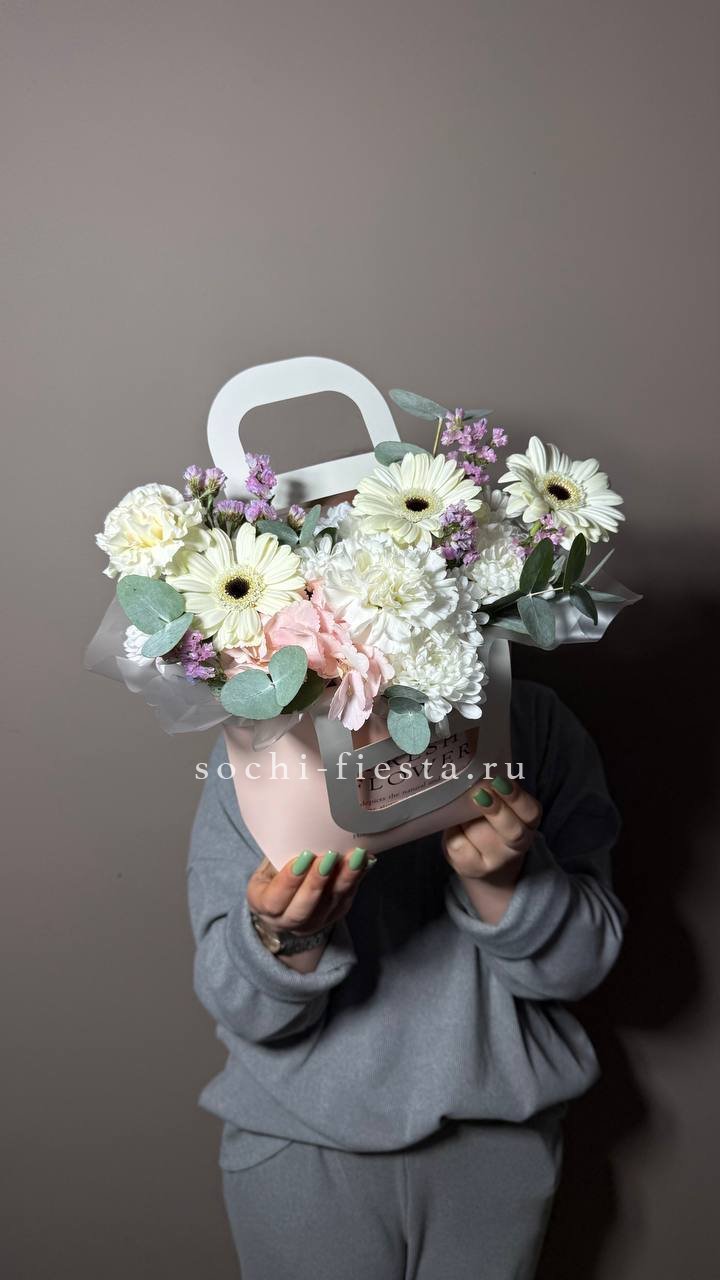 сумочка с гортензией, мисти баблс, герберой, озатамусом и эвкалиптом.