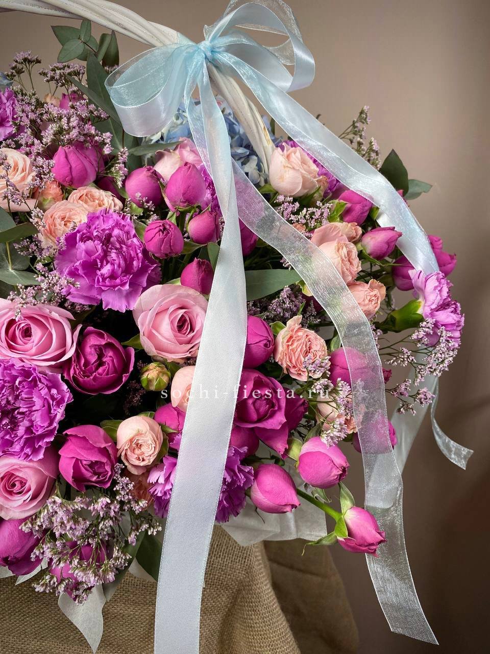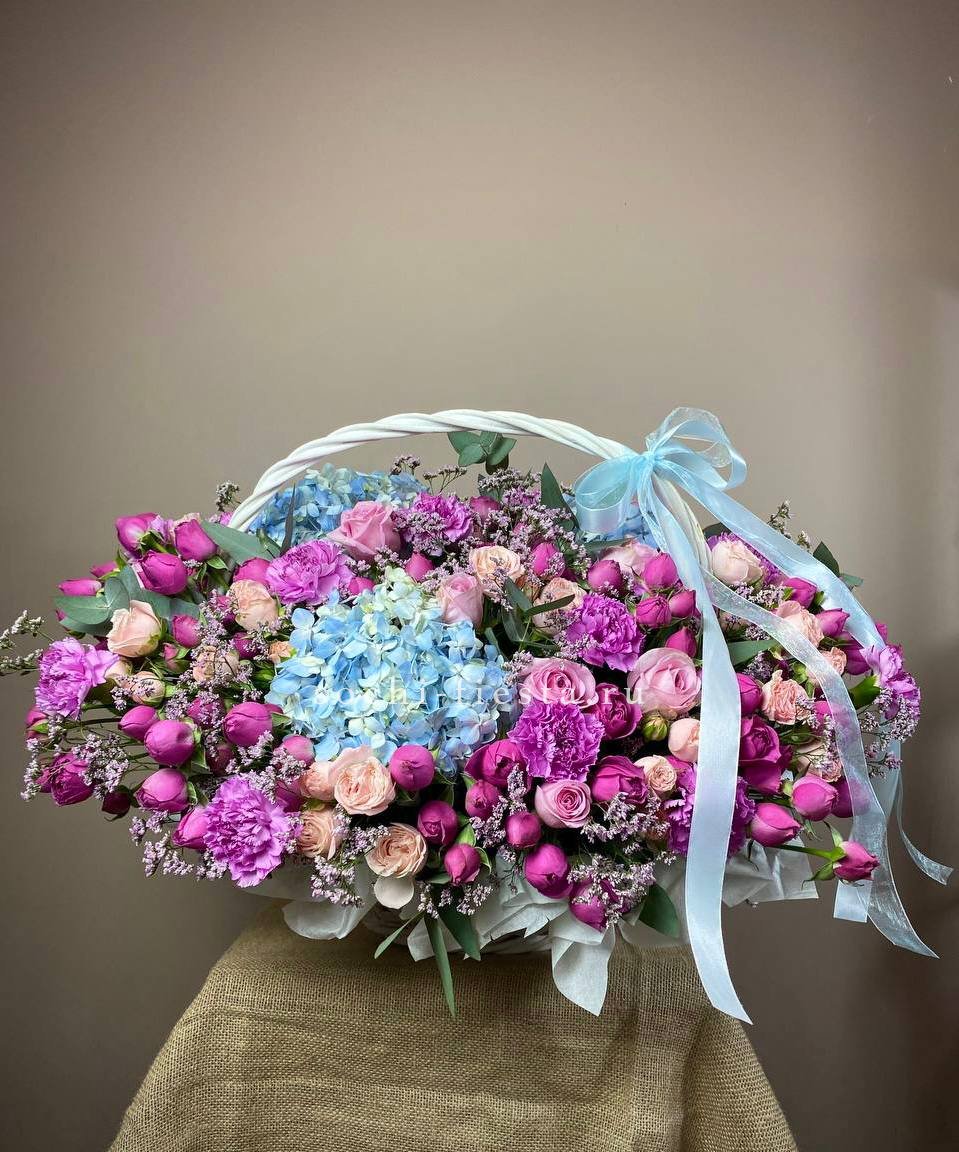 Пышная корзина с бархатными гортензиями и розами разных форм создает живописную композицию в романтичной гамме. Альстромерии и диантусы добавляют воздушности между крупными соцветиями.