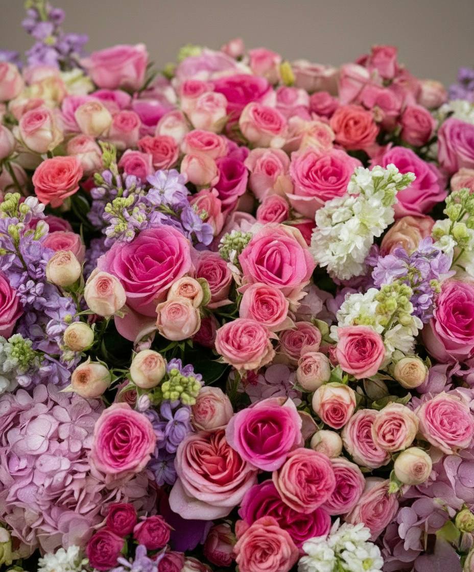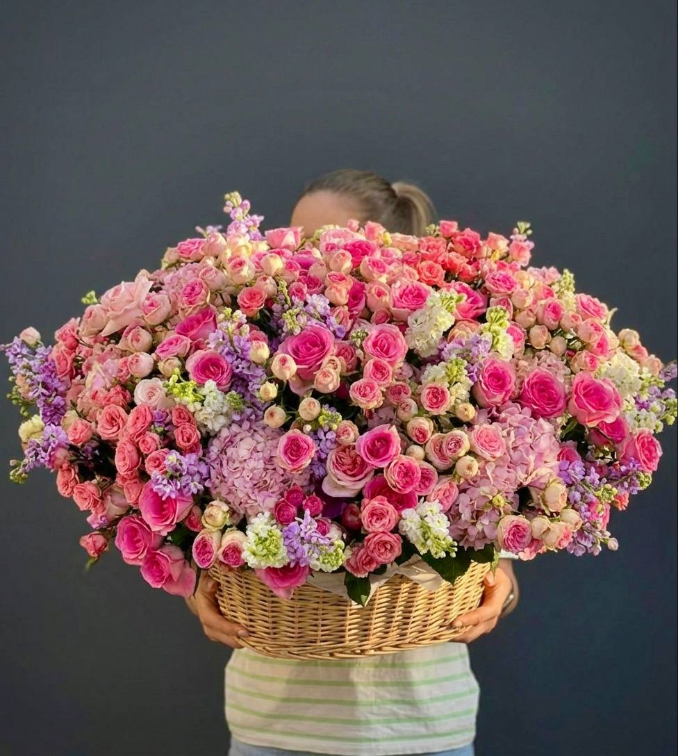 Пышная корзина с розами и гортензиями собрана плотно и объёмно. Маттиола добавляет живую текстуру между крупными соцветиями, а кустовые розы заполняют композицию мягкими переходами. Результат — впечатляющее присутствие, которое меняет восприятие пространства.