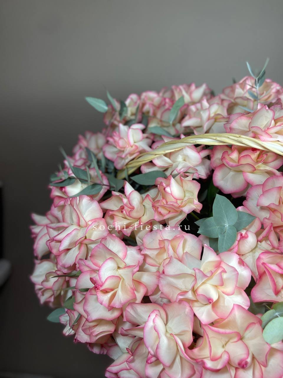 маттиола, гортензии, кустовые розы, розовые розы в корзине.