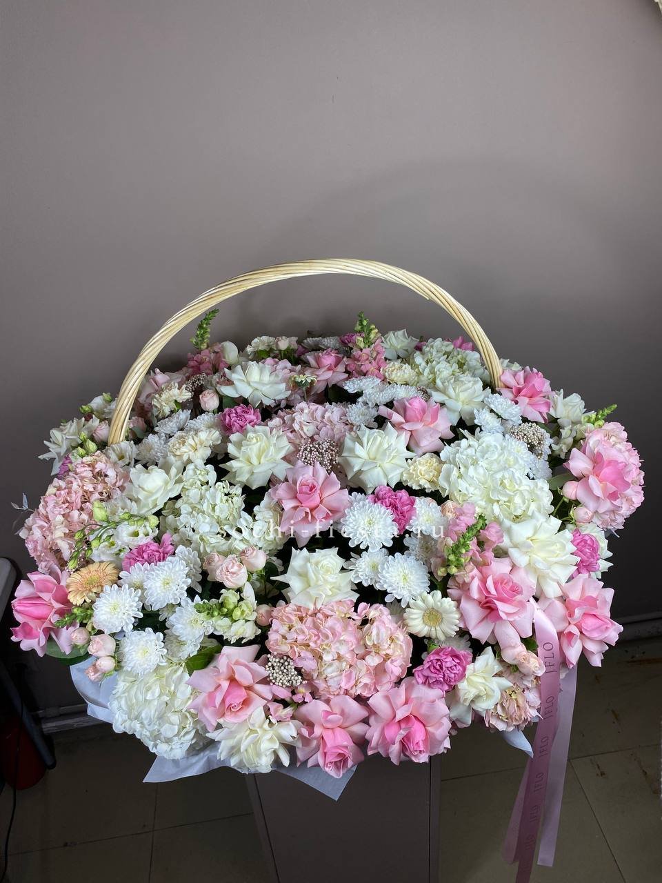 Широкая корзина вмещает пышную композицию из гортензий, эустом и пионовидных роз. Цветы располагаются свободно, создавая впечатление садовой клумбы, перенесенной в интерьер.