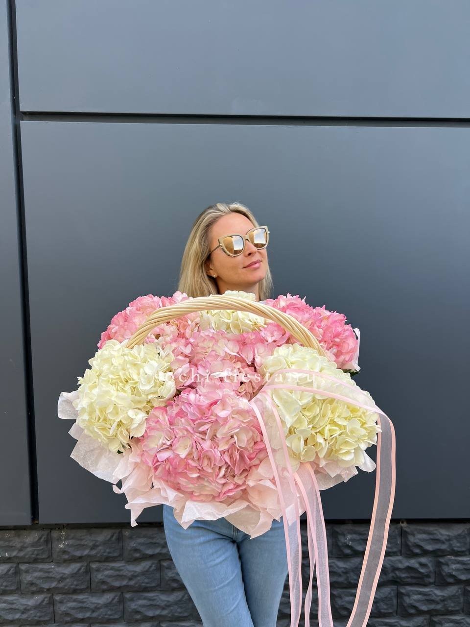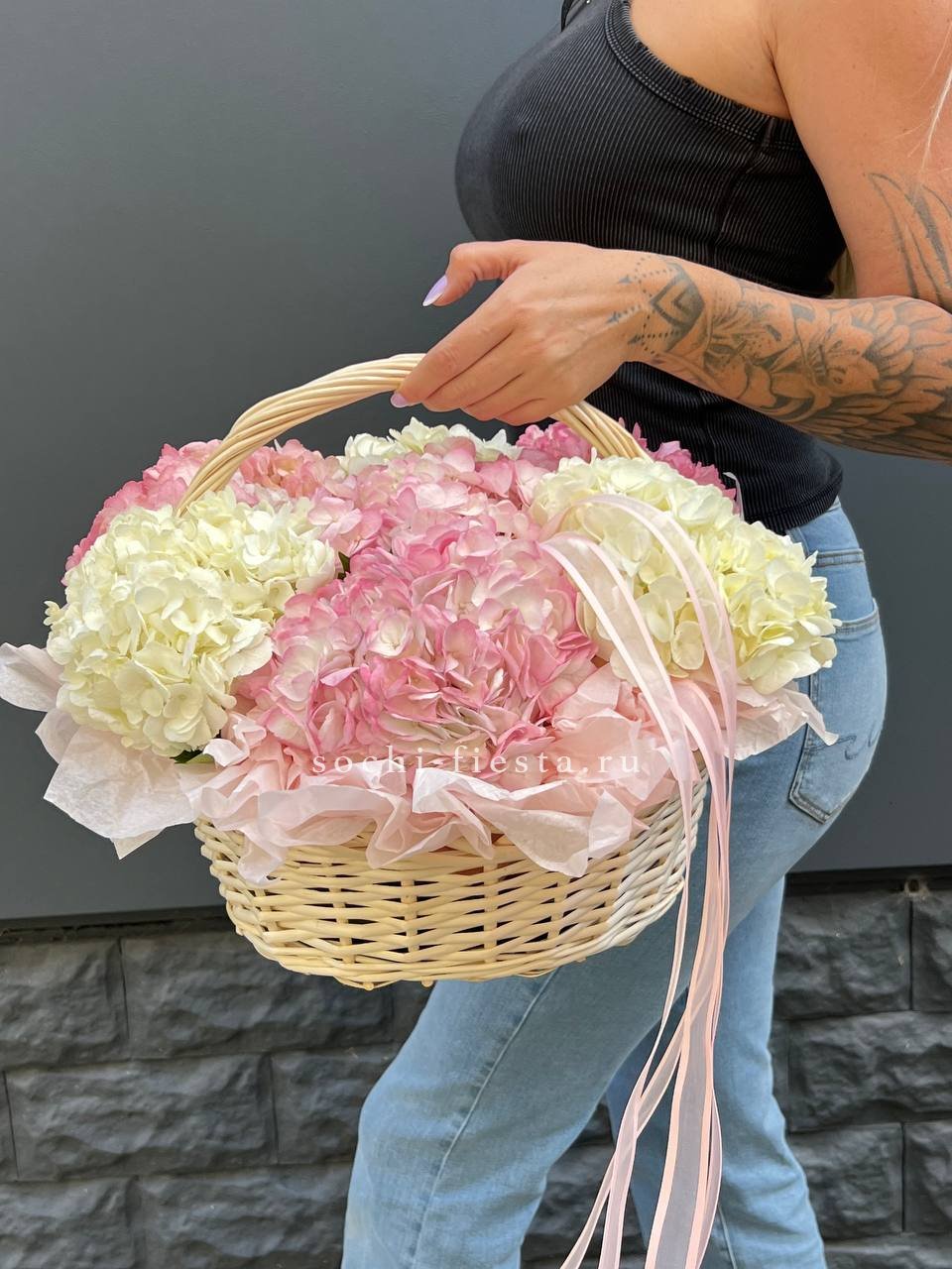 Плетёная корзина вмещает густую композицию из белых и розовых бутонов. Хризантемы и розы перемежаются с соцветиями гортензии, а статица добавляет воздушности между крупными головками цветов.