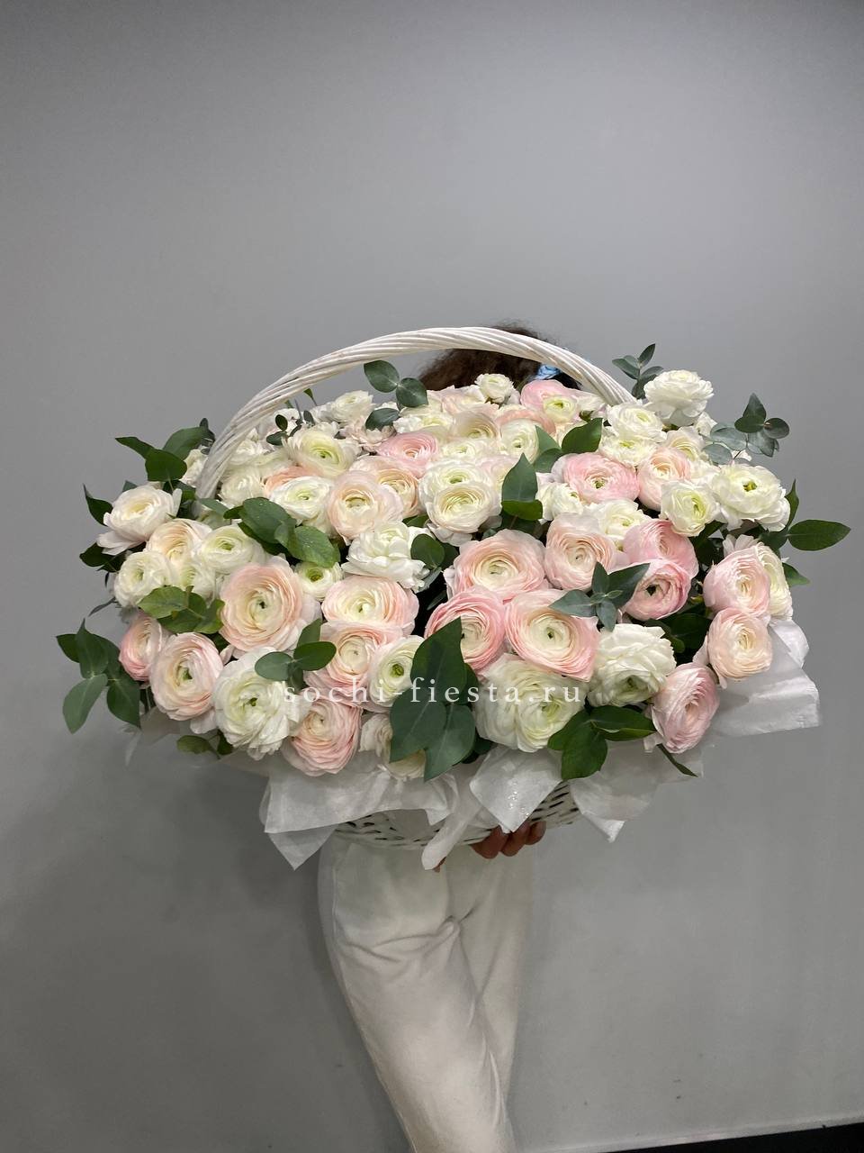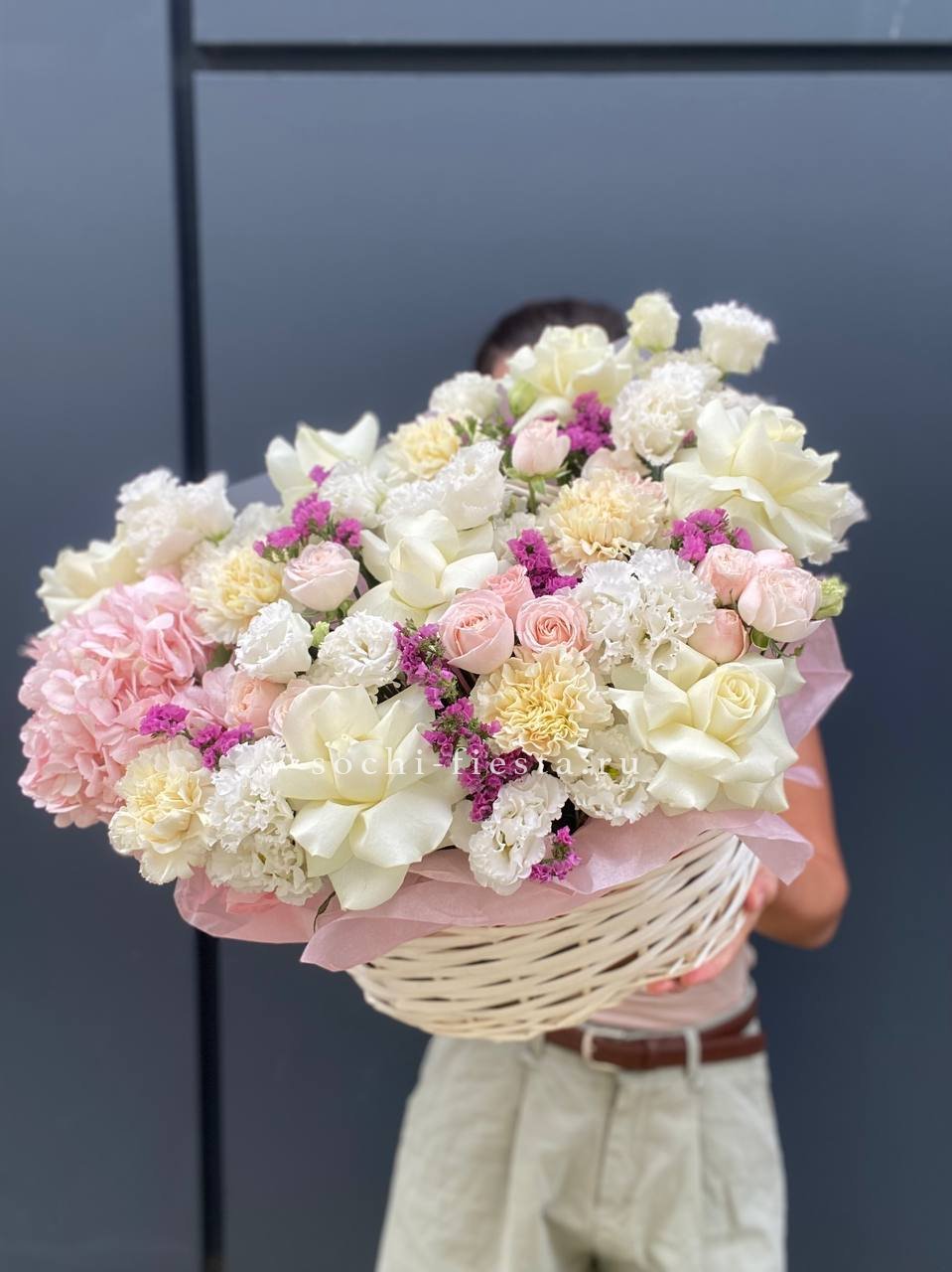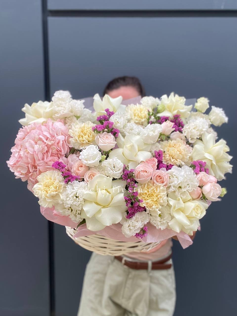Пышные пионовидные розы Мисти Баблс и бомбастик создают объёмное облако в естественной плетёной корзине. Диантусы и статица добавляют воздушности, а эвкалипт завершает композицию свежими нотами. Яркое присутствие в любом пространстве.