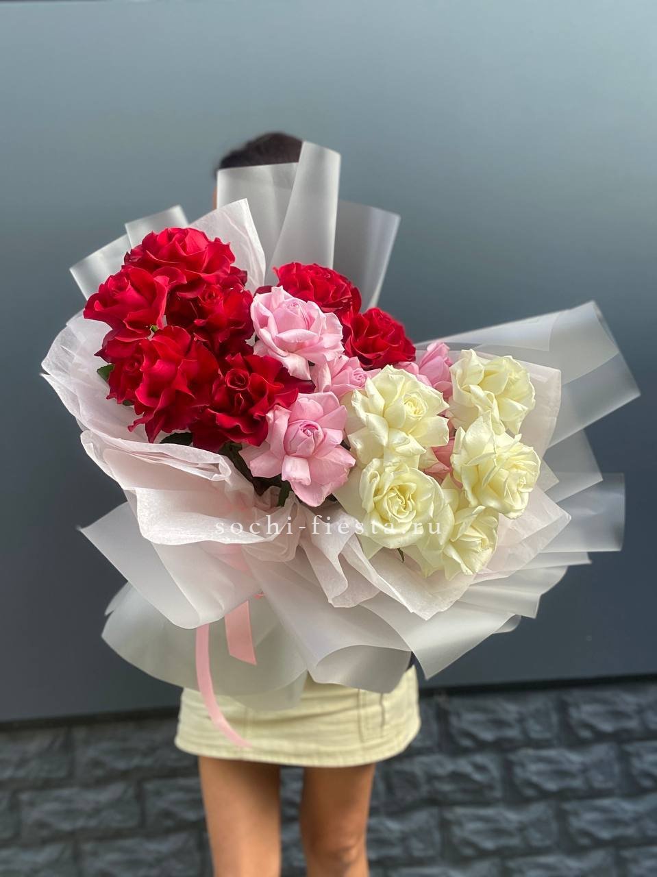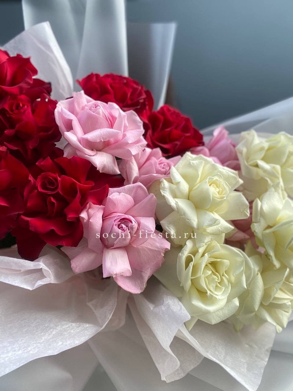 Семнадцать роз в трехцветной гамме: белые, розовые и красные бутоны чередуются свободно. Переходы оттенков создают живую динамику без четких границ.