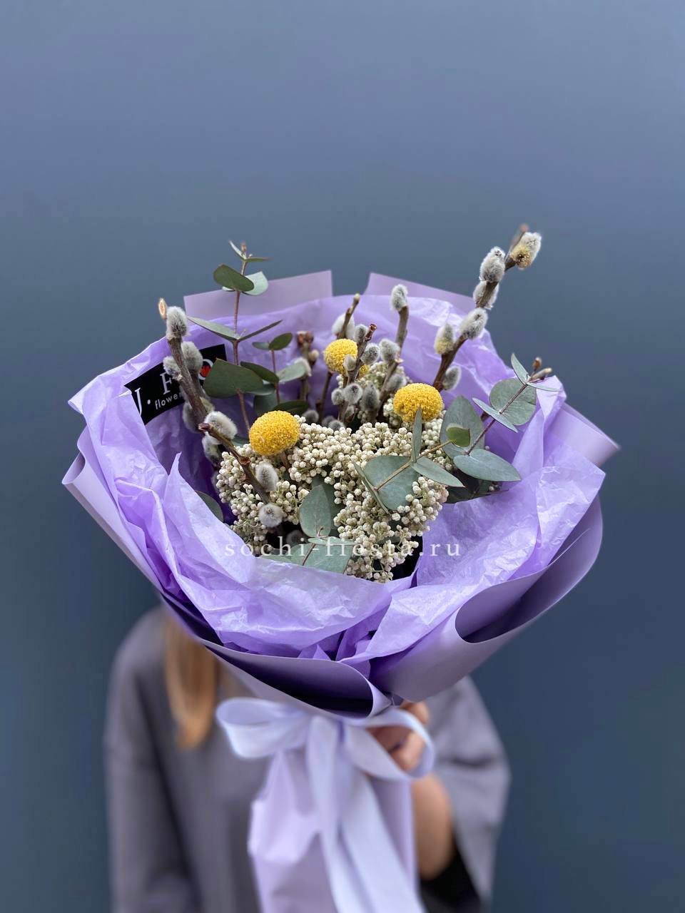 Пушистые ветви вербы собраны в плотный пучок и обрамлены серебристым эвкалиптом и мелкими соцветиями озотамнуса. Композиция держит форму и напоминает о весенних прогулках за городом.