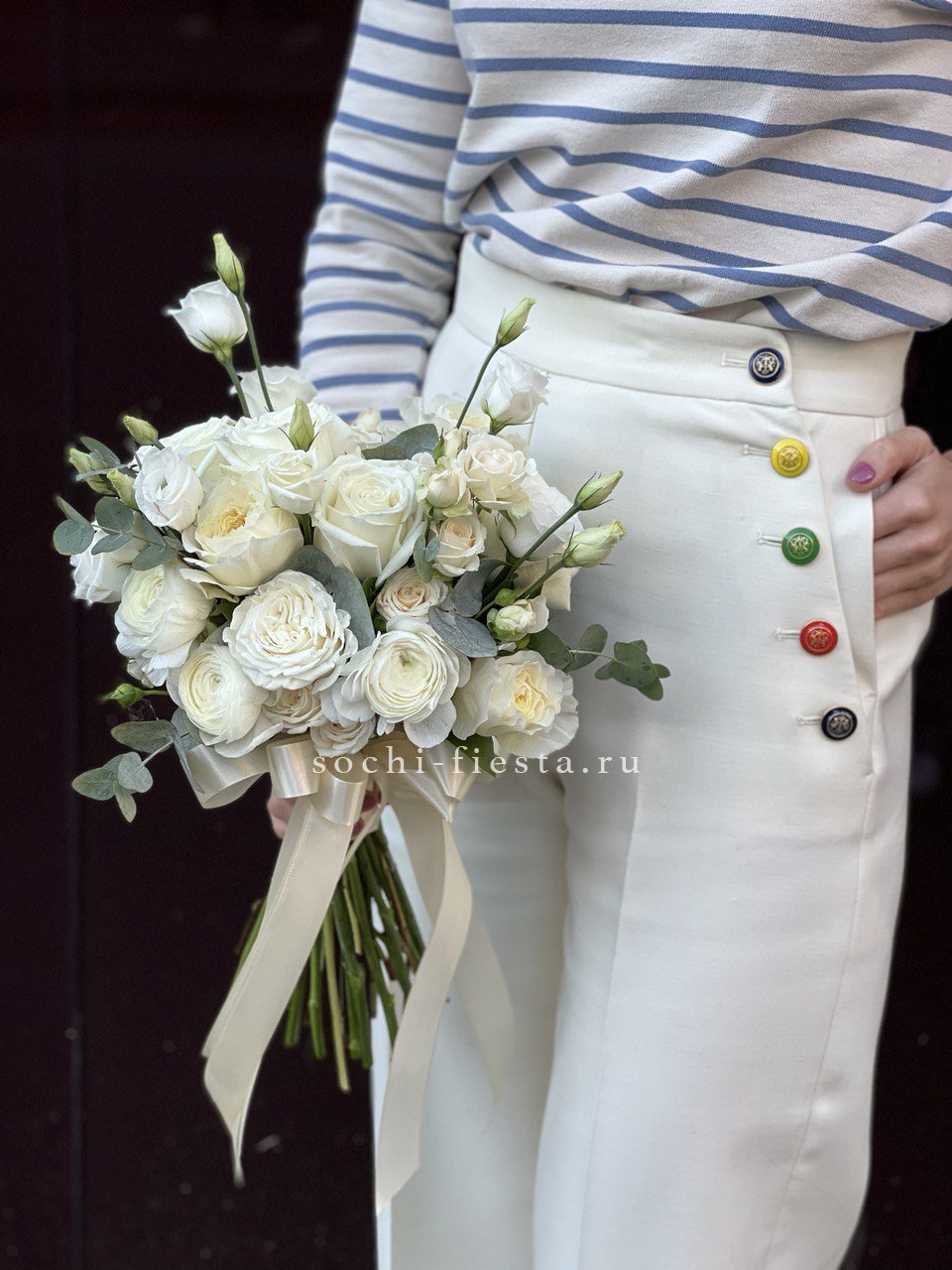 эустома, белые одноголовые розы, сезонный цветок (фрезия / альстромерия / эустома), эвкалипт, лента.