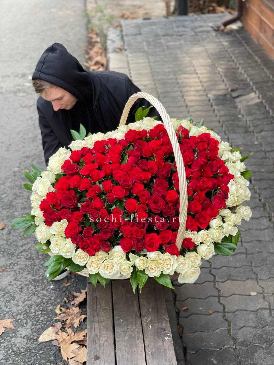 Пятьсот одна роза образует форму сердца из белых и красных бутонов. Плотная композиция в корзине удерживает симметрию и объём без дополнительных конструкций. Готовое решение для выражения чувств в масштабной форме.