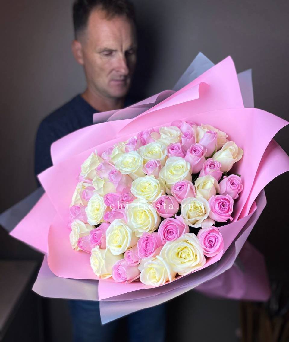 В составе 45 красно-белых роз.