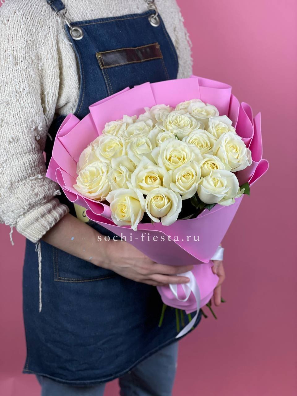 25 белых роз, лента, упаковка на выбор.