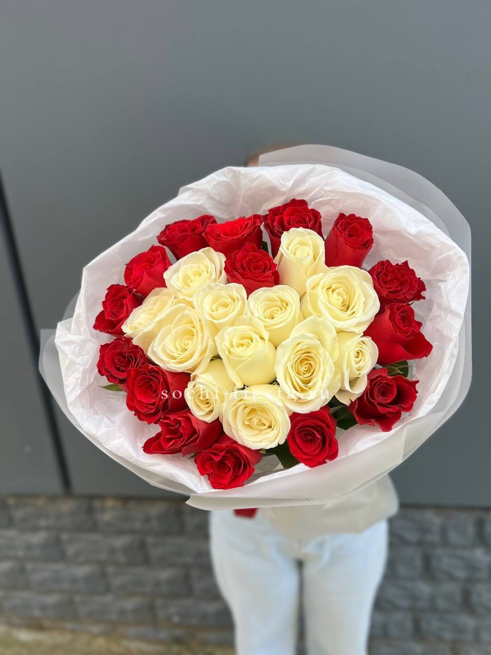 Тридцать пять белых бутонов образуют плотный монохромный ансамбль. Классическая форма и чистота оттенка позволяют букету звучать самодостаточно в любом интерьере.