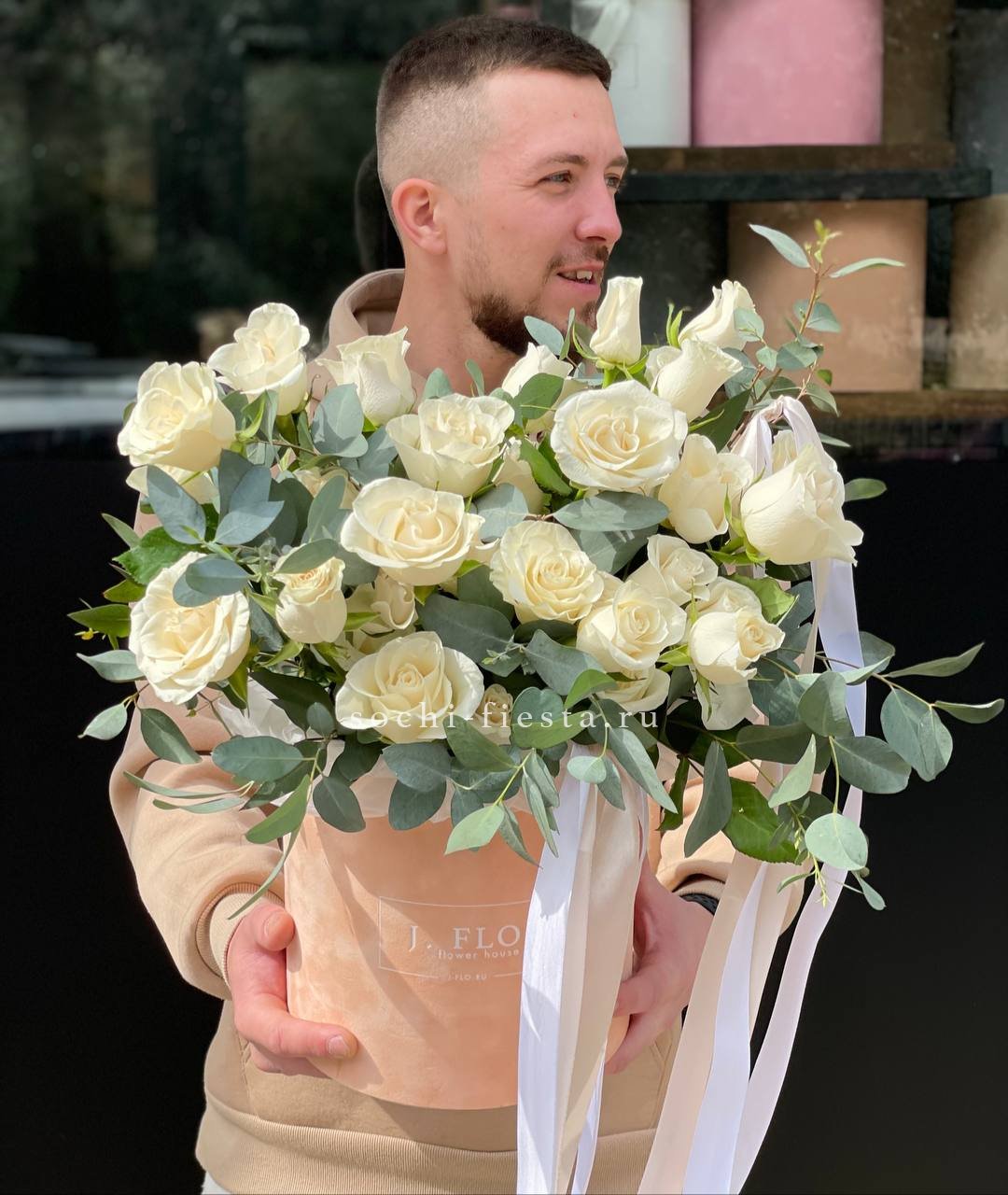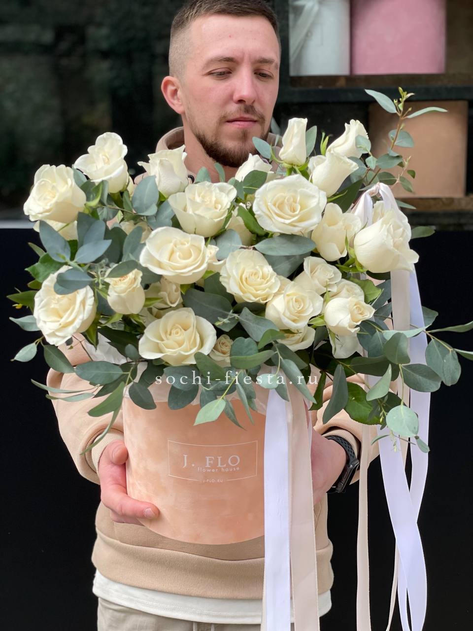 белые французские розы в боксе с эвкалиптом.