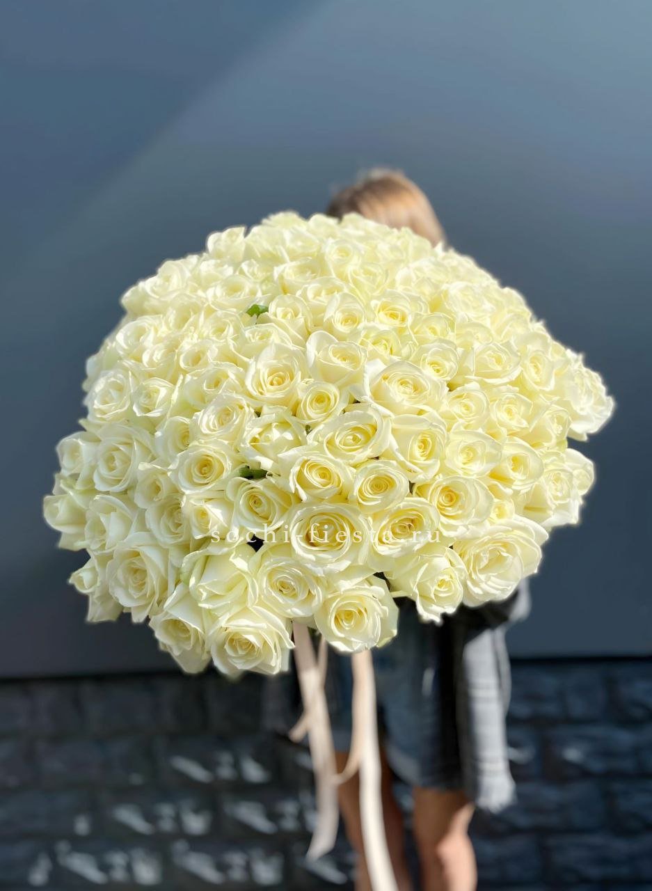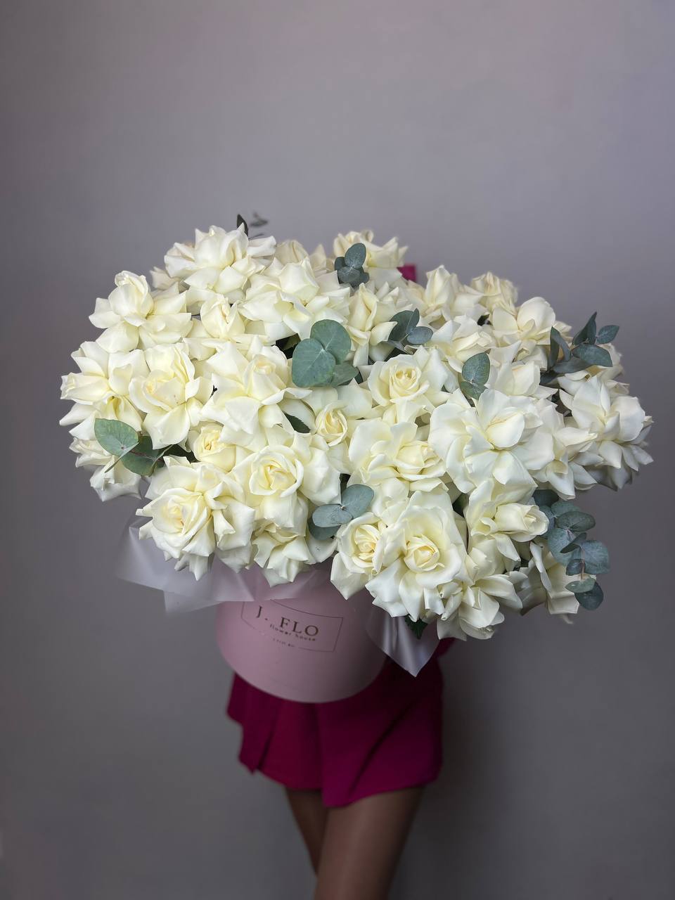 Тридцать семь белых французских роз собраны в круглый бокс с ветками эвкалипта. Плотная укладка бутонов создает объемную композицию, где каждый цветок виден и держит форму. Безупречное решение для яркого события.