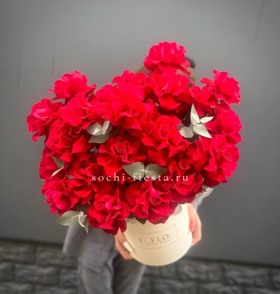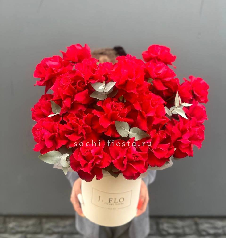 Вывернутые лепестки создают объёмную волнистую поверхность, которая меняет восприятие букета с каждого ракурса. Красный цвет звучит насыщенно и глубоко, а эвкалипт вносит лёгкую прохладу в общую картину.