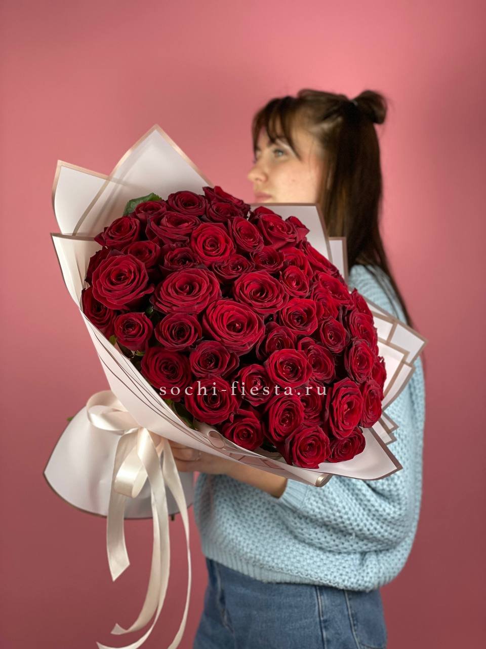 Тридцать пять бутонов с развернутыми лепестками создают насыщенное красное пятно в пространстве. Эвкалипт обрамляет композицию и добавляет воздуха между цветками.