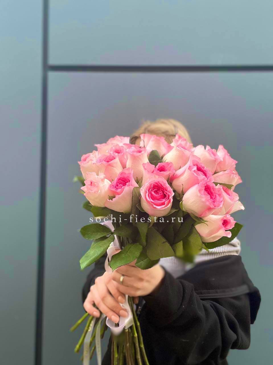 Пятьдесят один бутон с двухцветным переходом от белого края к розовой середине. Пионовидная форма создаёт пышную текстуру и глубину. Лента фиксирует композицию без лишних деталей.