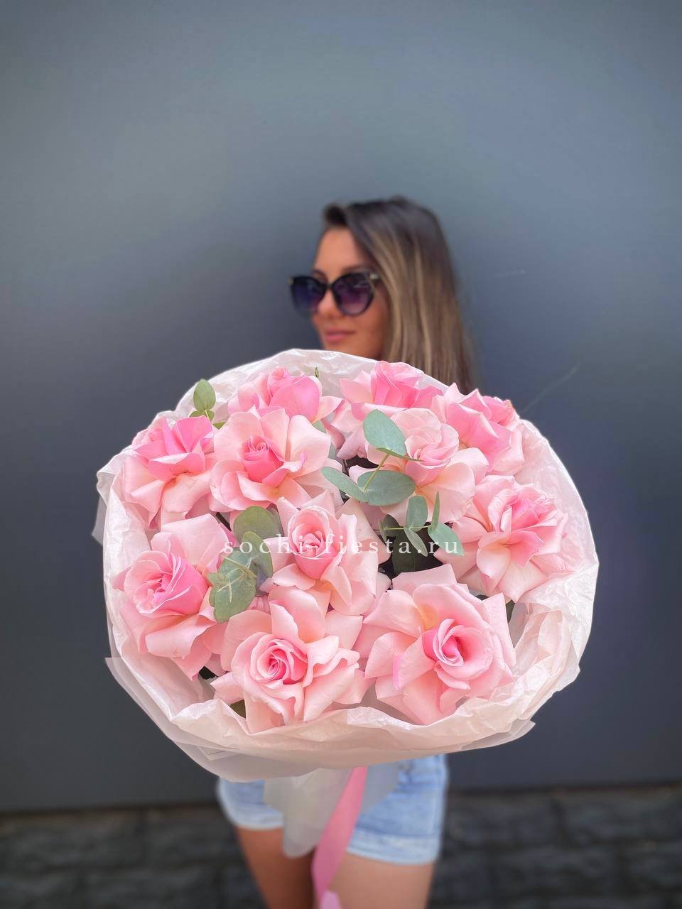 Одиннадцать вывернутых роз с открытой сердцевиной притягивают взгляд игрой света на лепестках. Авторская упаковка и веточка эвкалипта завершают композицию.