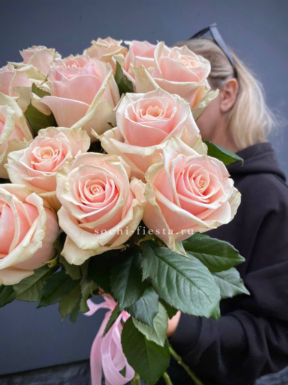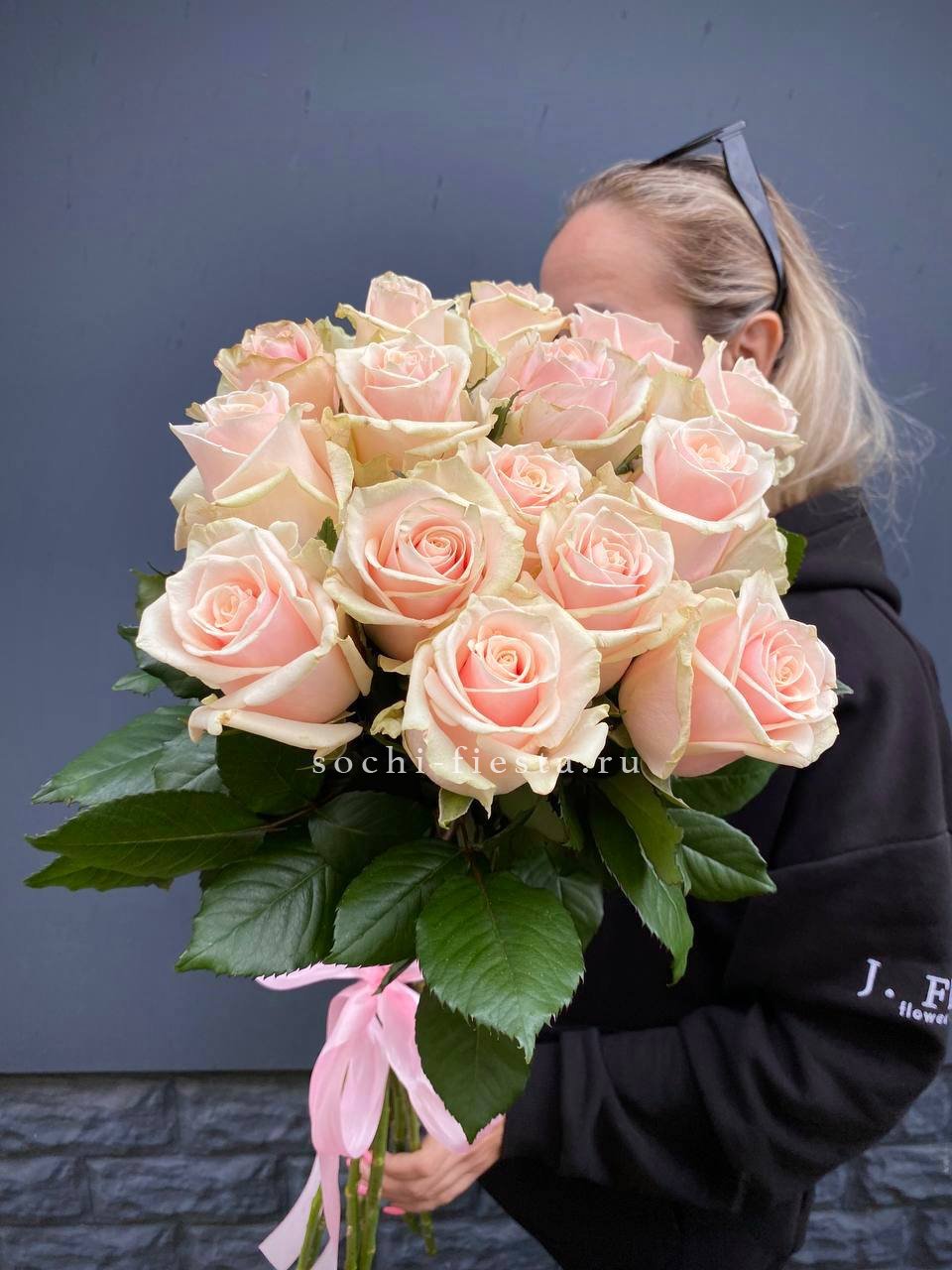 15 высоких кремовых роз, лента, упаковка на выбор.