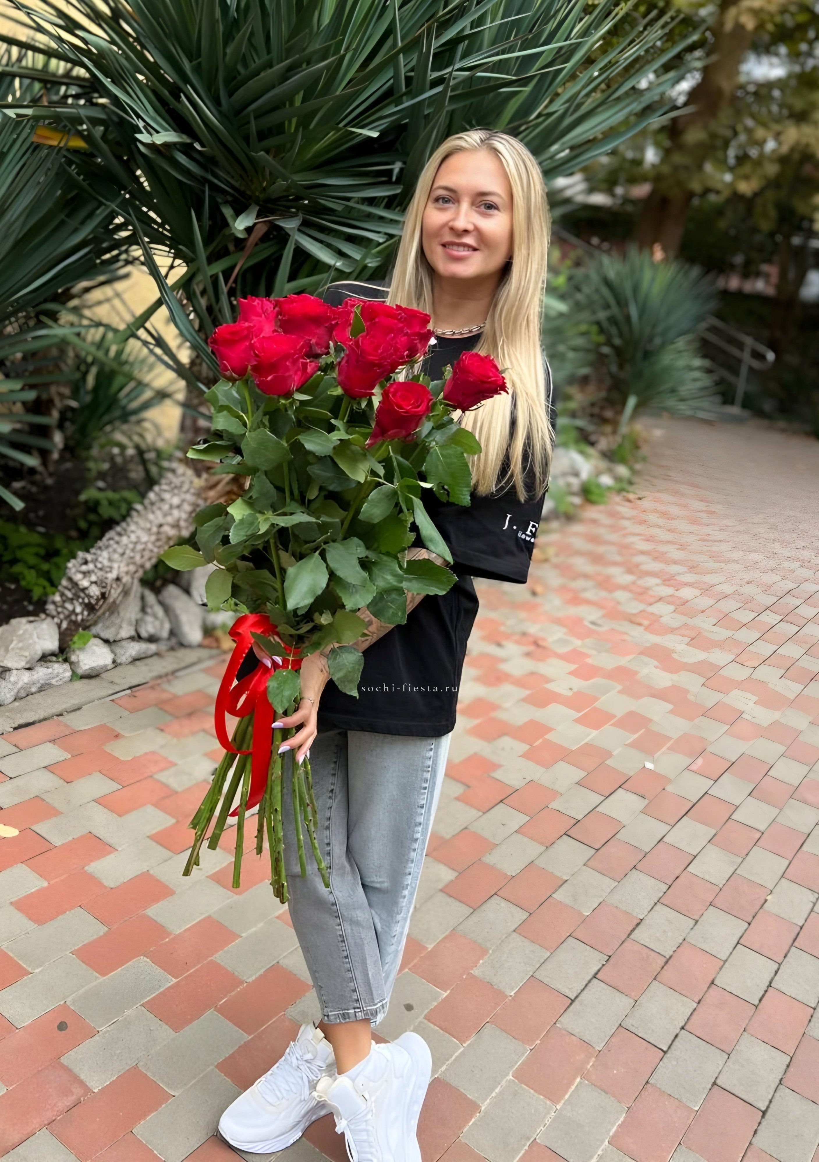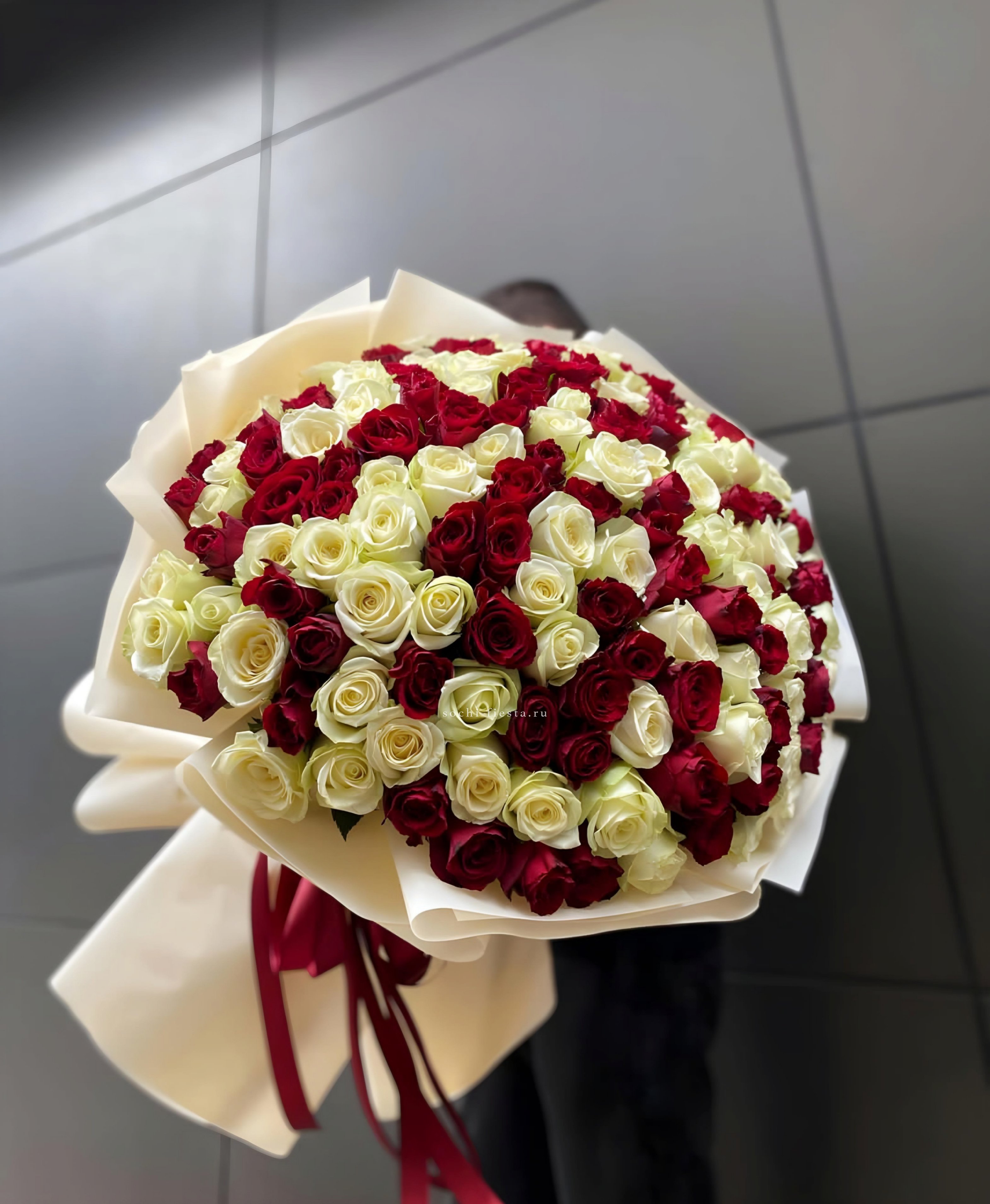 Сто одна белоснежная роза собрана в монументальный букет классической формы. Высокие стебли образуют графичный силуэт, а плотное расположение бутонов создаёт впечатляющий объём. Лаконичная лента завершает композицию.