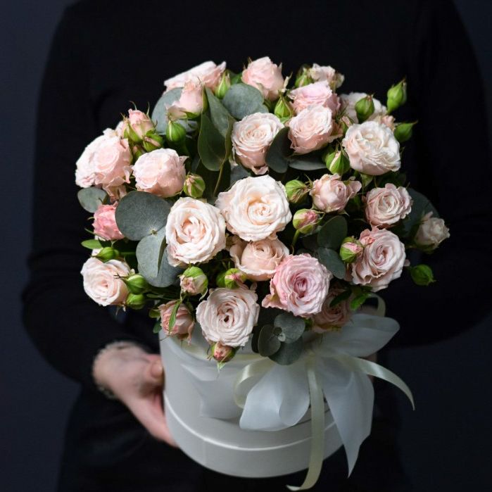 Семь пышных кустовых роз собраны в плотный круг и обрамлены воздушными ветками хамелациума. Бутоны раскрыты почти полностью, создавая объёмную шапку с мягкими переходами оттенков. Композиция держит форму и выглядит самодостаточно.