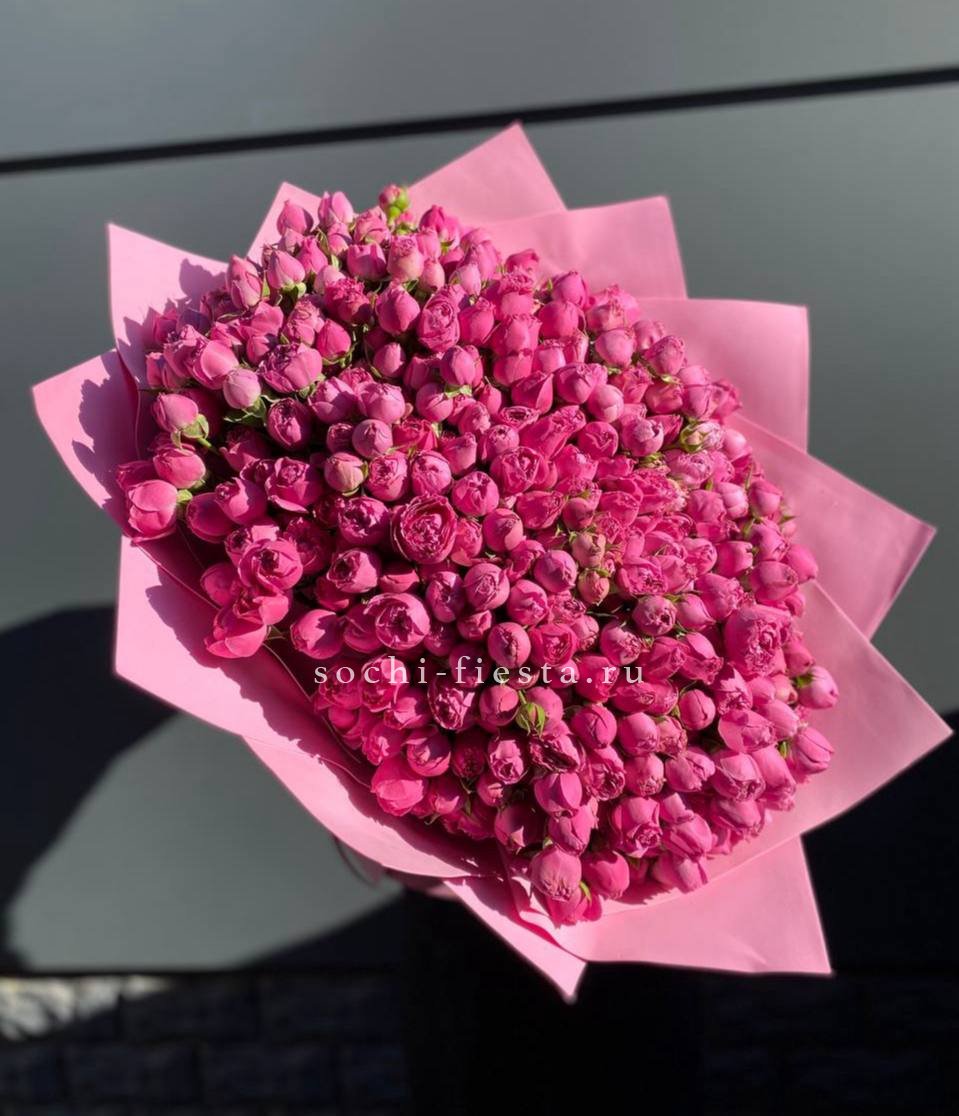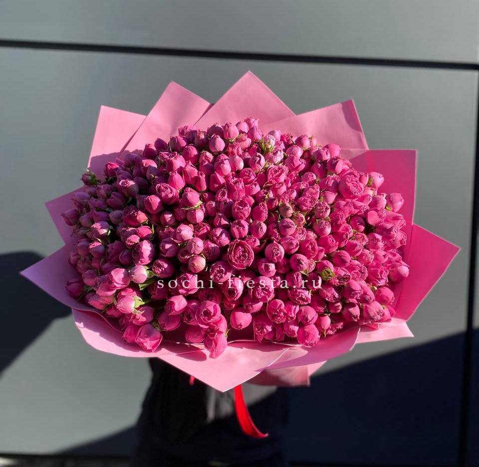 25 пионовидные кустовые розы,  хлопок, лента, дизайнерская упаковка.