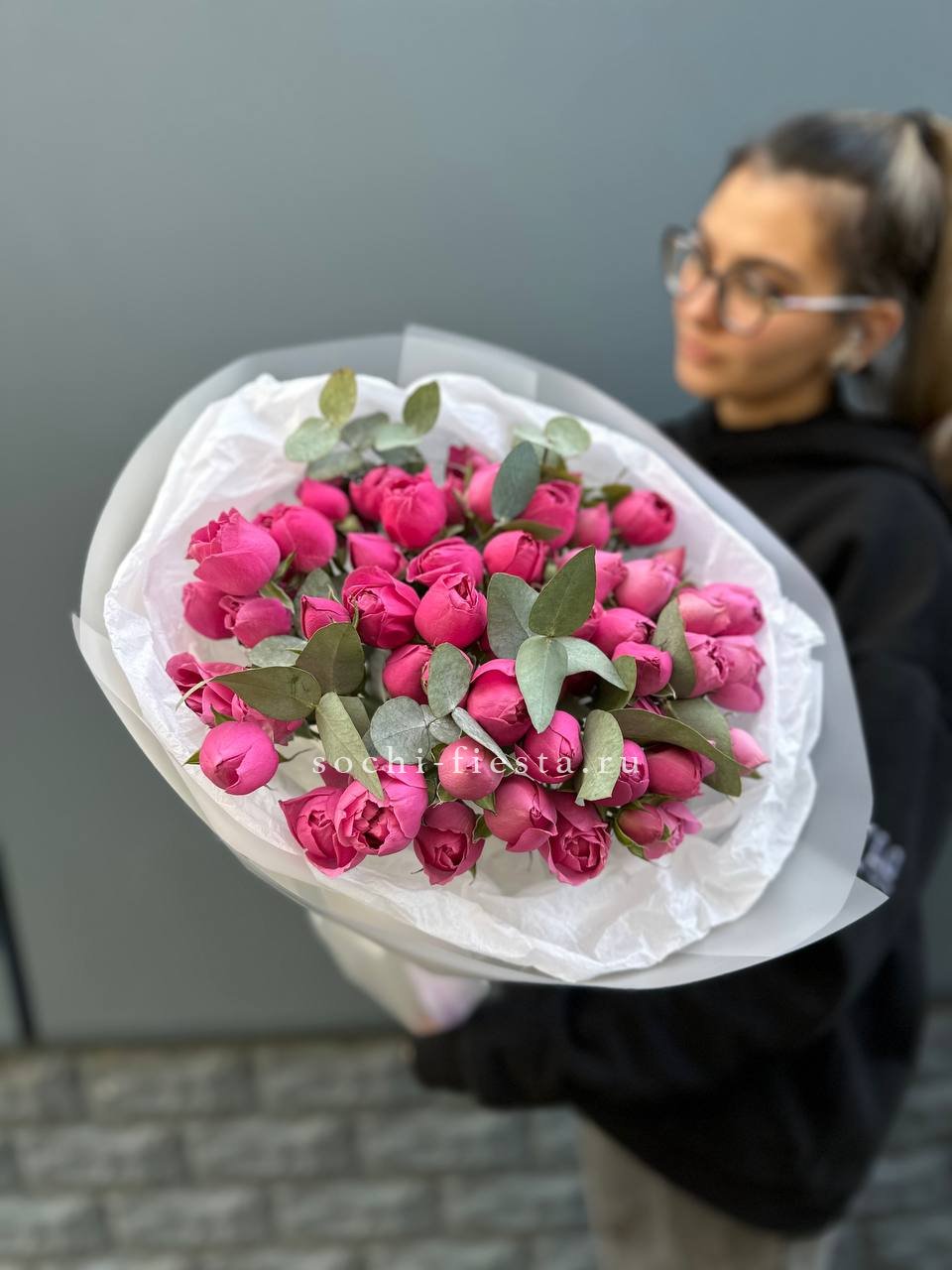 Девять бутонов Мисти Бабблс собраны плотно, формируя округлый силуэт с мягкими линиями. Эвкалипт обрамляет композицию, добавляя объем и воздушность.