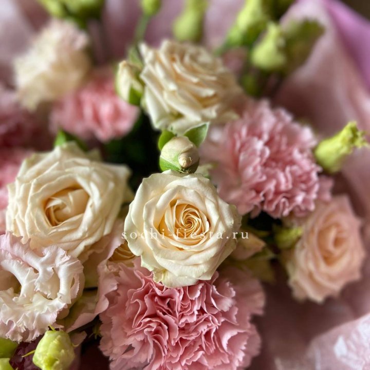 Состав сборных букетов в Липецке: розы (Freedom, Mondial), хризантема кустовая, альстромерия, эустома, фрезия. Дополнительно в сезон — тюльпаны, нарциссы, ранункулюсы, ирис. Поставки в Липецке раз в 3-5 дней из ближайшего регионального центра. Флорист планирует ассортимент под дату поставки и знает, что будет в наличии к нужному дню.