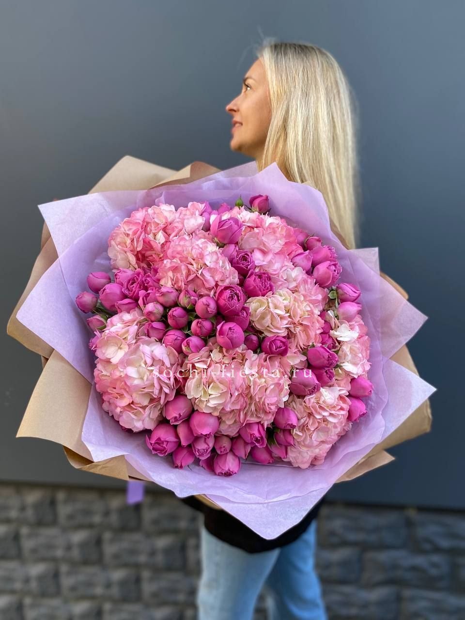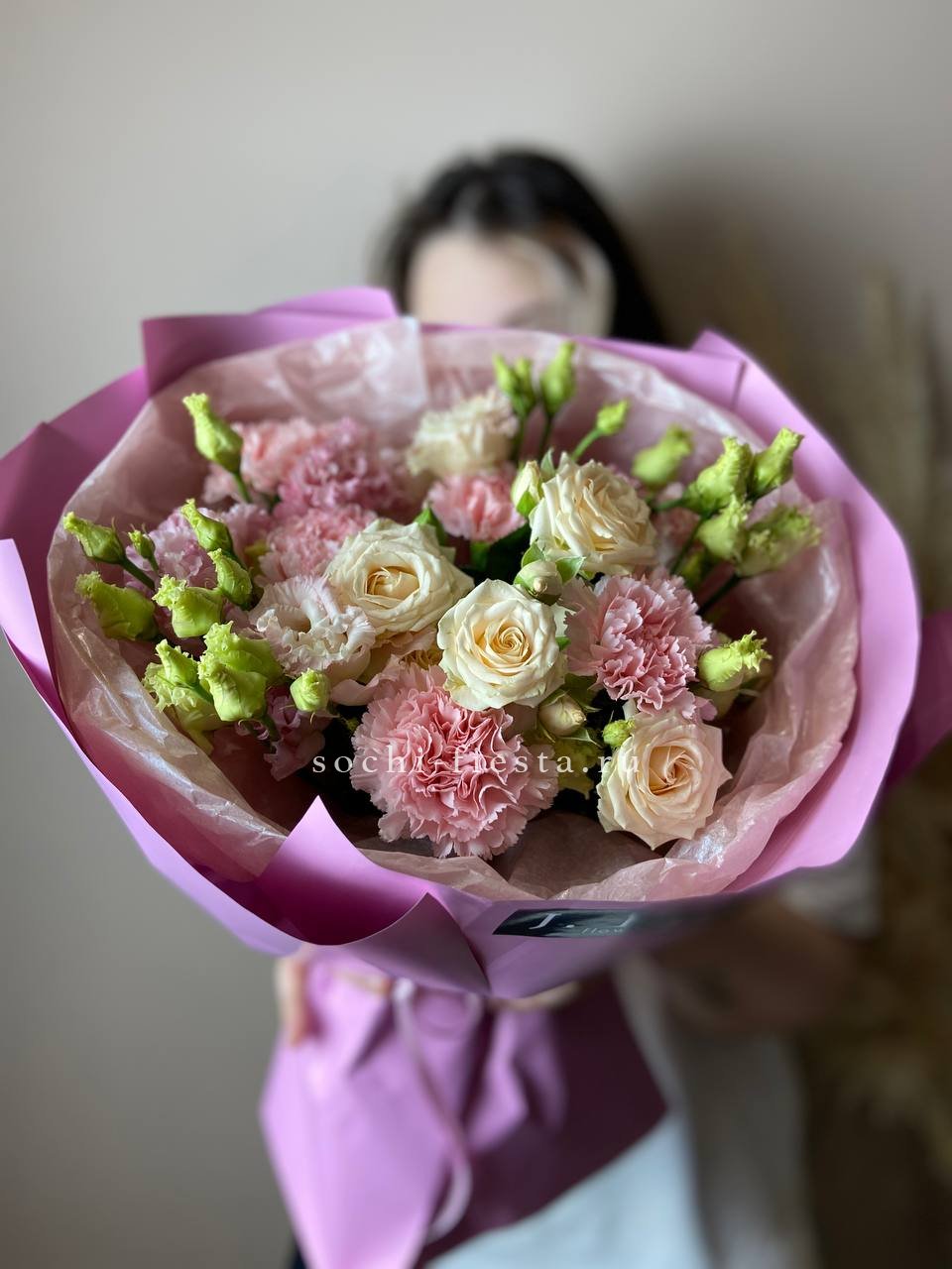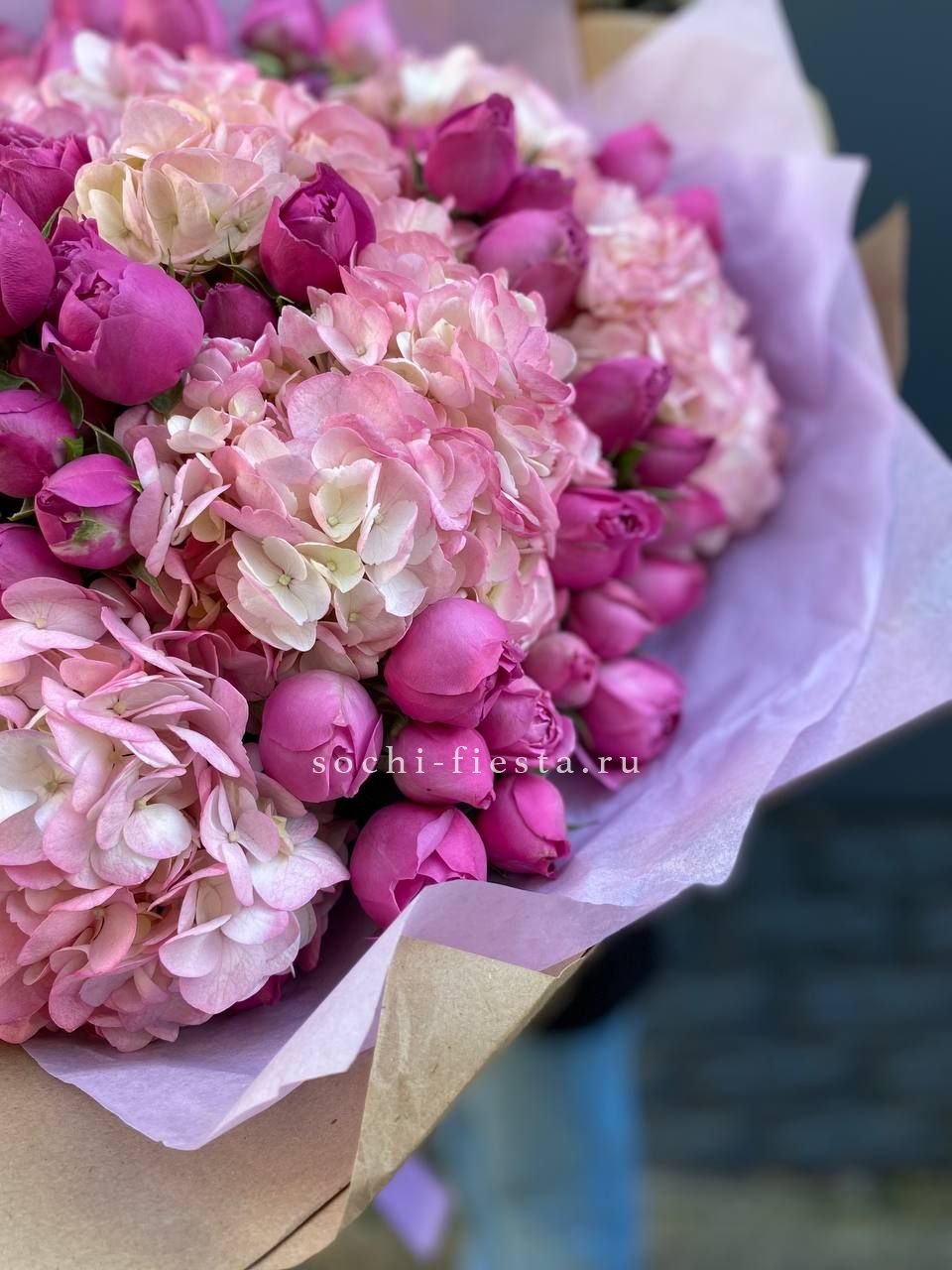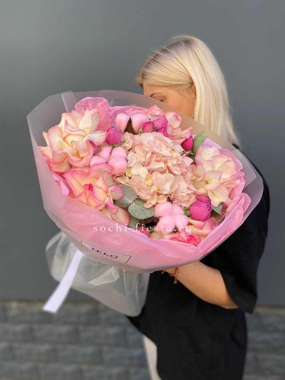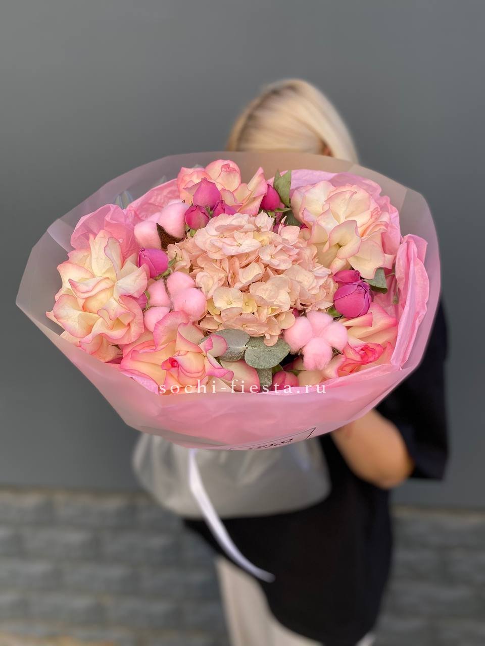 гортензия, белая роза, диантус, хризантема, эустома, озатамус, пленка.