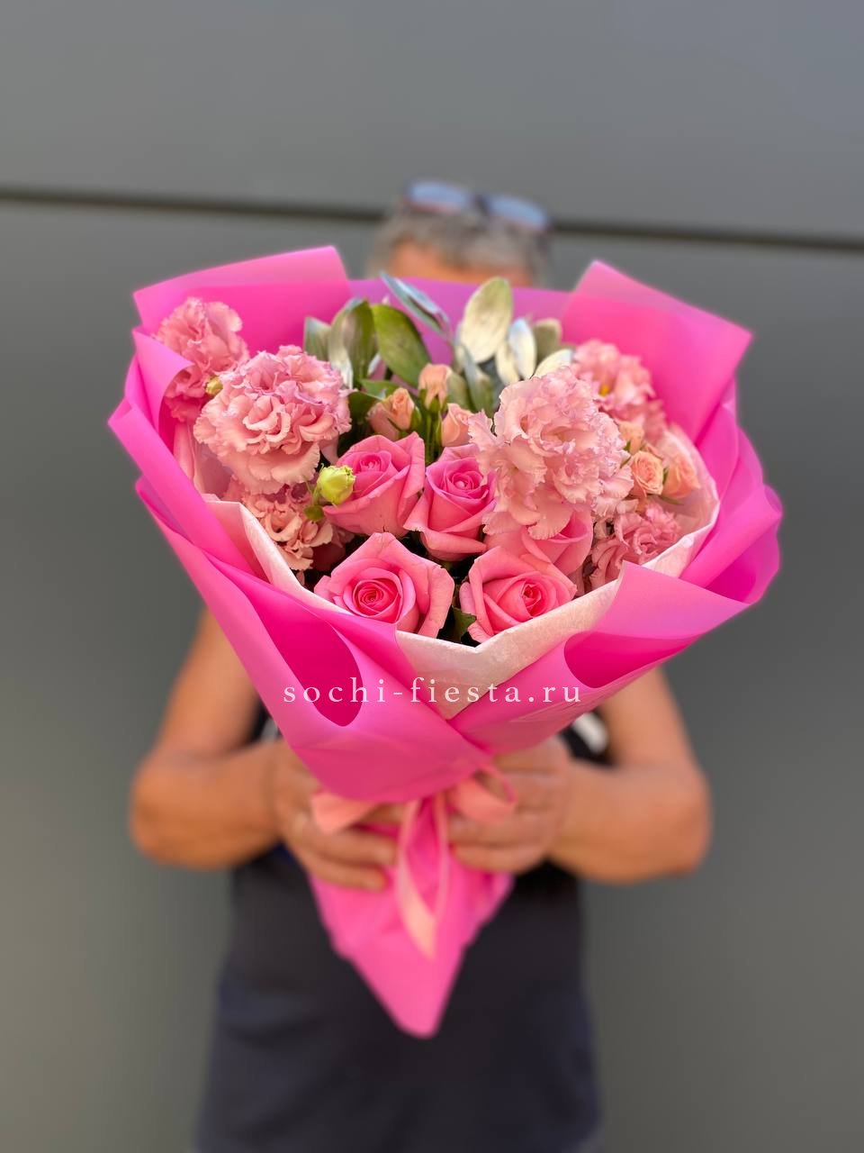 диантус, эустома, гортензия, хайди, эвкалипт, озатамус, пленка.