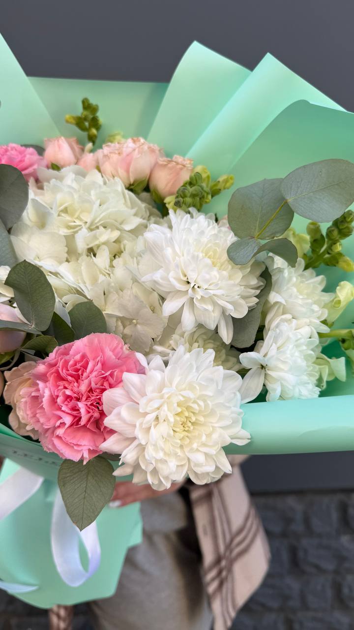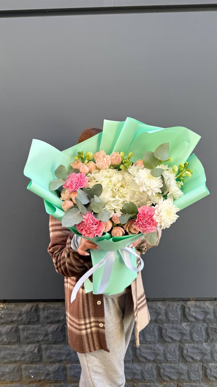 Плотная сборка с пышной гортензией в центре и рассыпчатыми соцветиями диантуса по краям. Эустома добавляет воздушности, а ветки озатамуса создают лёгкую графику. Букет держит форму и выглядит объёмно с любого ракурса.