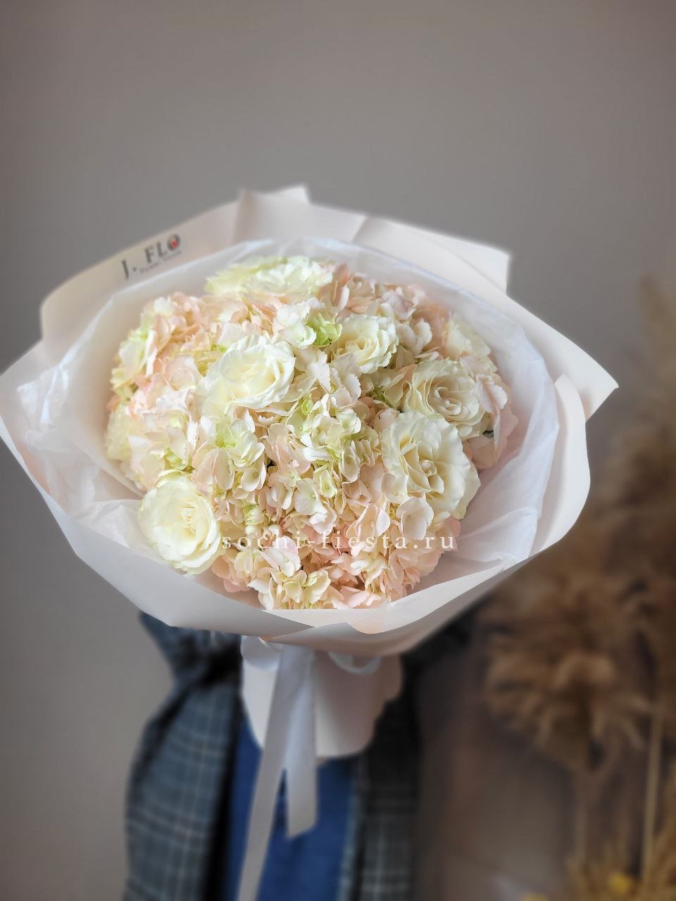 Яркие герберы встречаются с розами и хризантемами в плотной композиции. Гортензия добавляет объём, а хлопок создаёт мягкую текстурную волну по краю букета.
