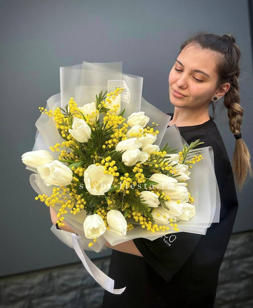Двадцать пять тюльпанов встречаются с солнечной мимозой в весеннем дуэте. Букет держит форму и радует глаз сочной зеленью стеблей. Это композиция для тех, кто ждал тепла и света.