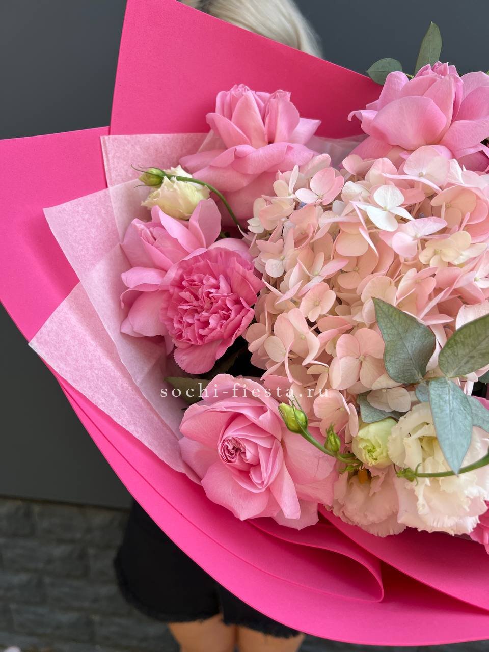 гортензия, роза одноголовая, бомбастик, декоративная зелень, эвкалипт, лента, дизайнерская упаковка.