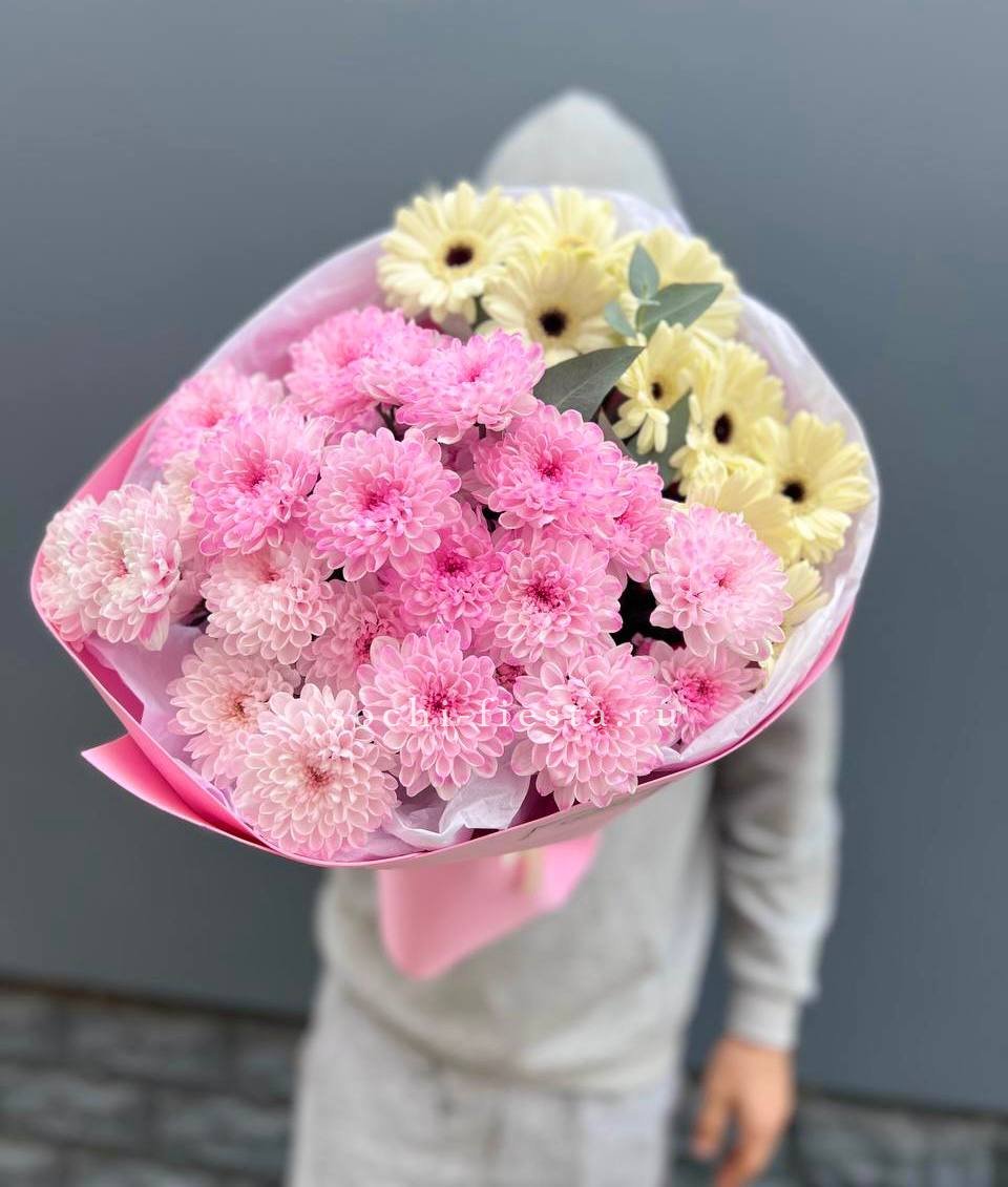 Солнечные герберы встречаются с пушистыми шапками хризантем в динамичной композиции. Веточки эвкалипта обрамляют цветы мягким зелёным контуром и придают свежесть.
