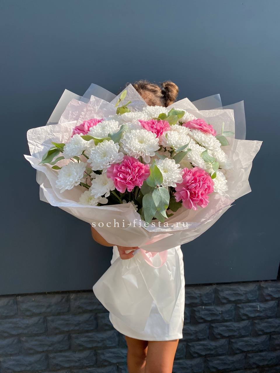 гортензия, эустома, кустовая пионовидная роза, альстромерия, диантус, лента, дизайнерская упаковка.