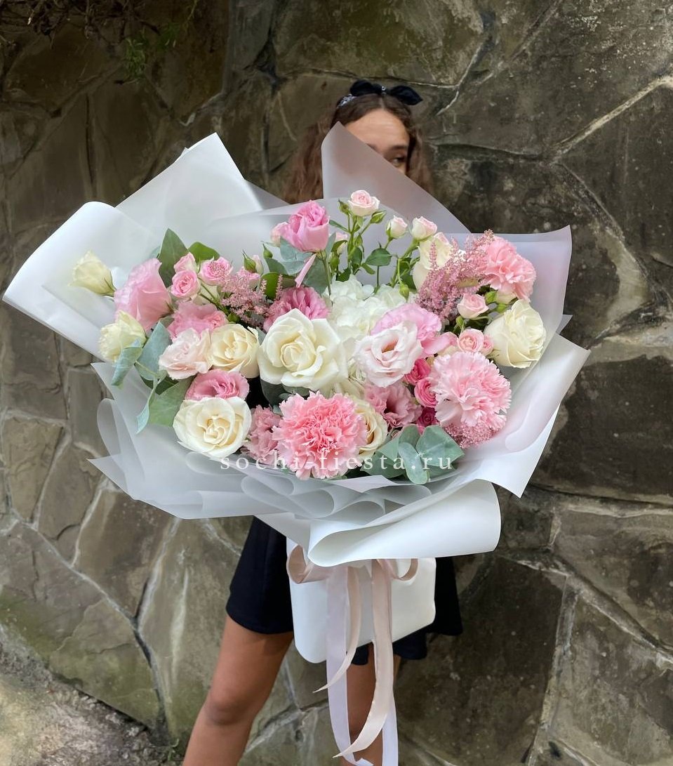 диантусы, розы, маттиола, фрезия, эвкалипт, лента, дизайнерская упаковка.