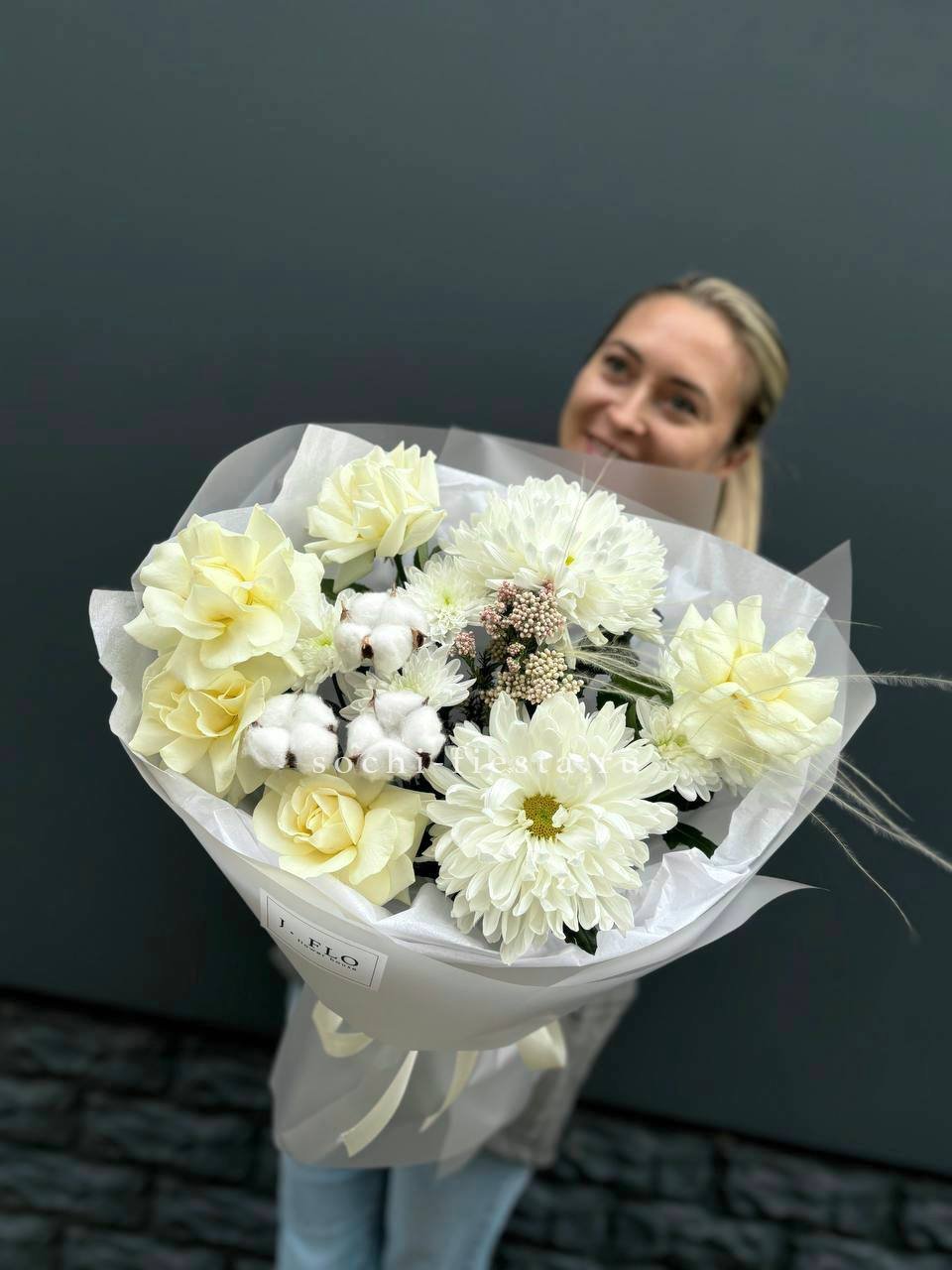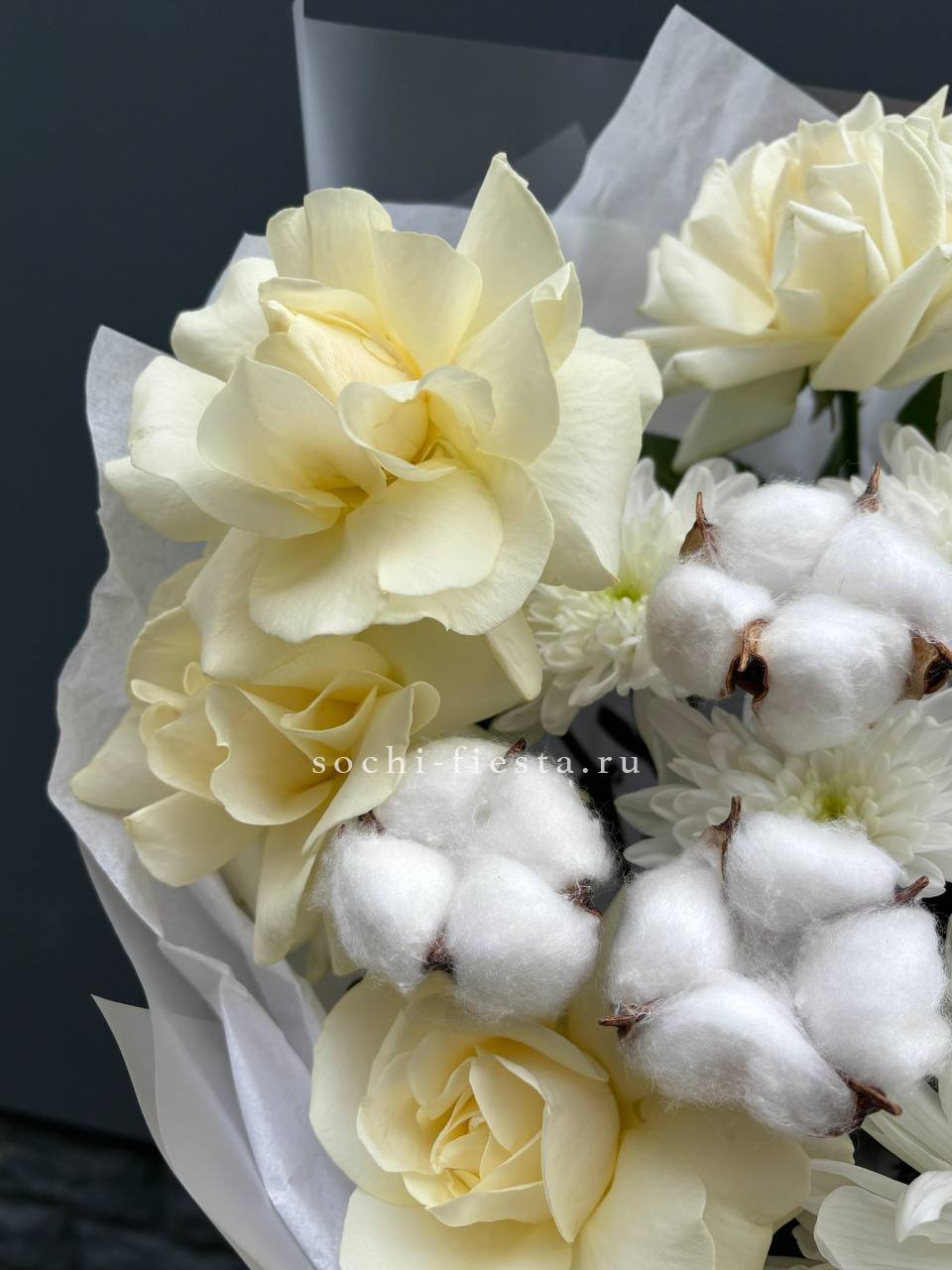 цветочная композиция с применением одноголовых хризантем, белых роз, озотамнуса или аналога, хлопка.