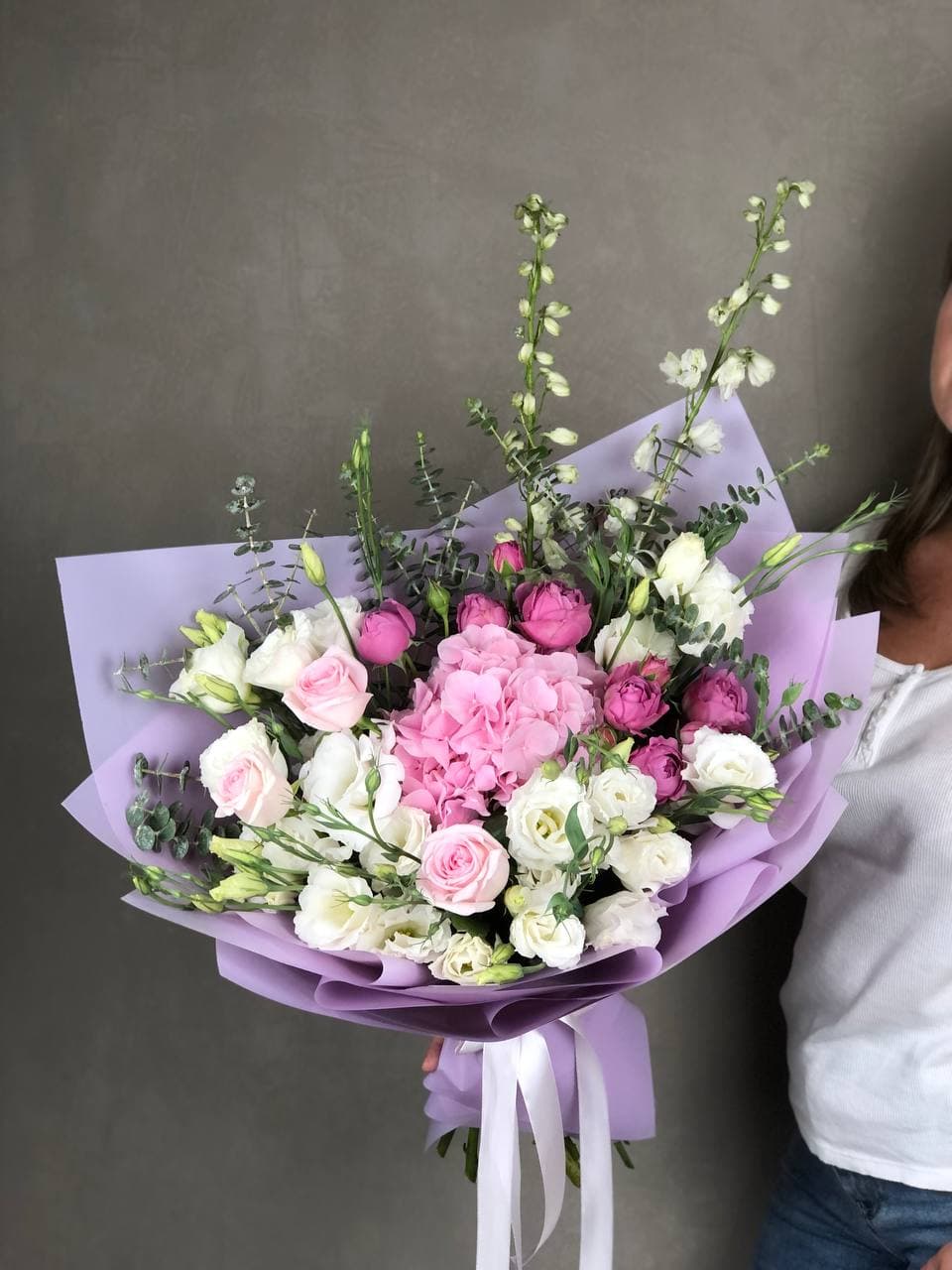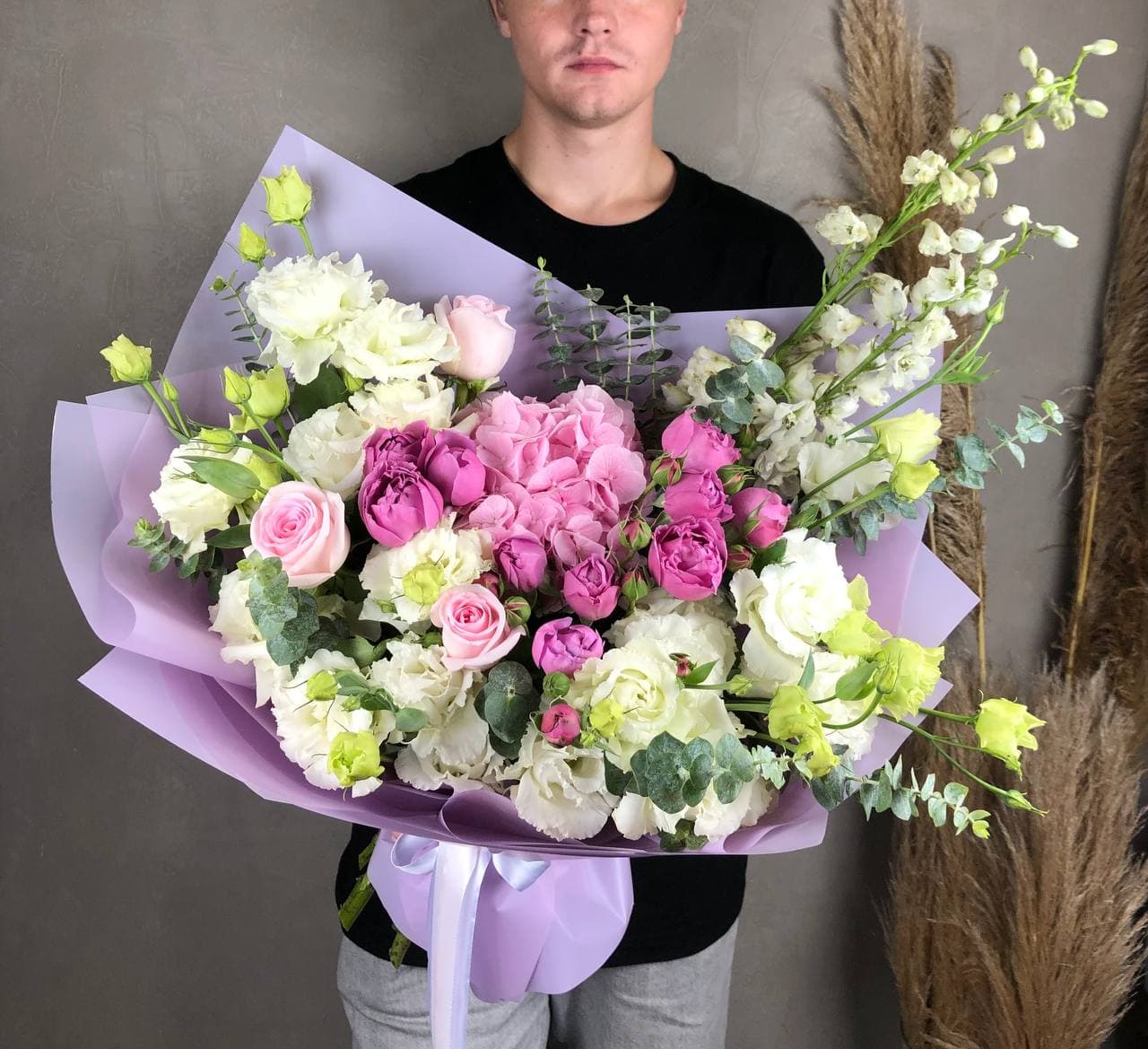 Белоснежная палитра с эустомой и пионовидными розами дополнена натуральным хлопком и эвкалиптом. Крупная композиция с выразительным присутствием и продуманной архитектурой. Форма держится долго благодаря плотности сборки.