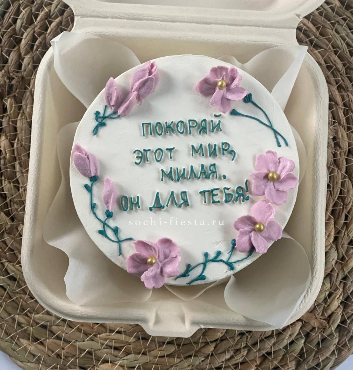 Дизайнерский бенто-торт ручной работы с поздравительной надписью и готовым декором. Формат удобен для камерного чаепития или как дополнение к основному подарку.