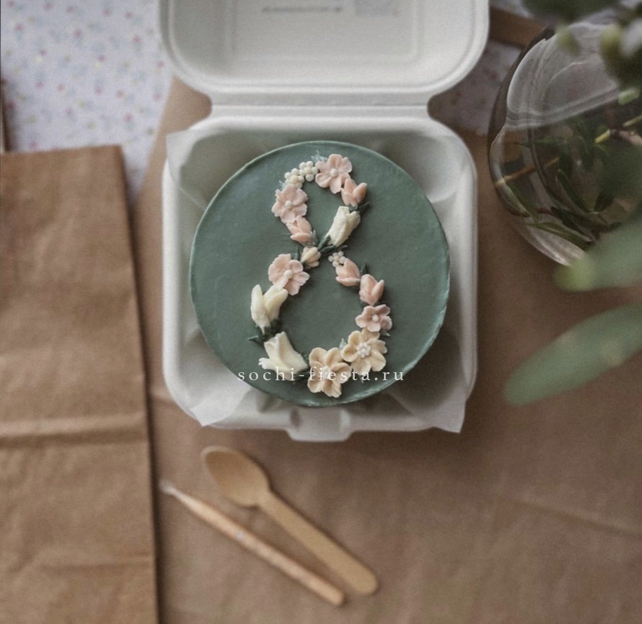 Авторский дизайн с весенней символикой на светлом фоне задает радостное настроение. Торт создан вручную с вниманием к каждой детали. На выбор две начинки: клубничный пломбир или шоколадный трюфель.
